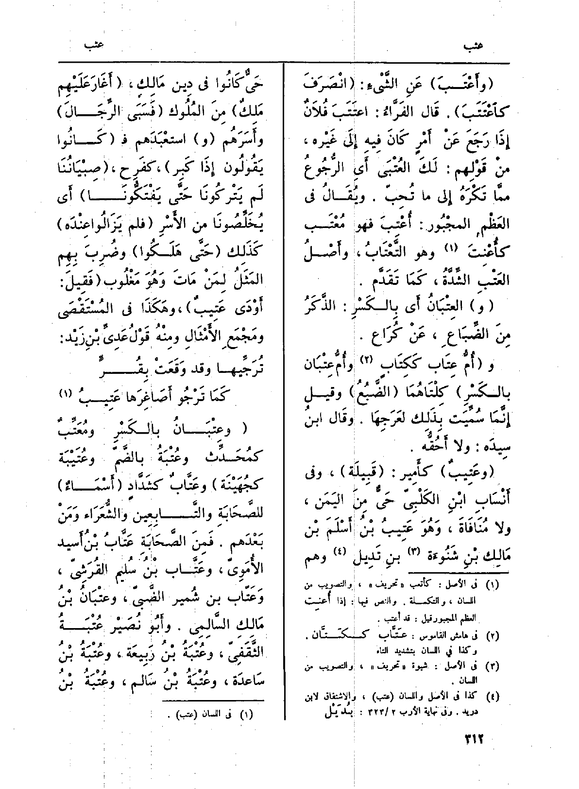 (وعِتْبَانُ بالكَسْرِ ومُعَتِّبٌ كمْحَدِّث وعُتْبَةُ بالضَّمّ وعُتَيْبَة كجُهَيْنَة) وعَتَّابٌ كشَدَّادٍ (أَسْمَاءٌ) للصَّحَابَ والتَّابِعِين والشُّعَرَاء وَمَنْ بَعْدَهم. فَمِنَ الصَّحَابَةِ عَتَّابُ بْنُ أَسيد الأُمَوِيّ، وعَتَّاب بْنُ سُليم القُرَشِيّ، وَعَتّاب بن شُمير الضَّبيّ، وعتْبَانُ بْنُ مَالِكِ السَّالِمِي. وأَبُو نُصَيْر عُتْبَةُ الثَّقَفِيّ، وعُتْبَةُ بْنُ رَبِيعَة، وعُتْبَةُ بْنُ سَاعدَة، وعُتْبَةُ بْنُ سَالم، وعُتْبَةُ بْنُ