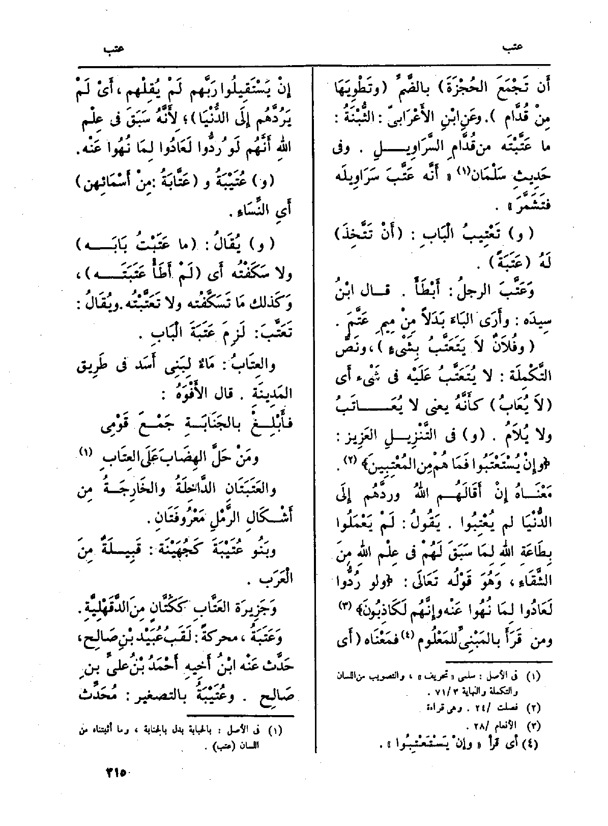 (وفُلَانٌ لَا يَتَعَتَّبُ بِشَيْءٍ) ، ونَصُّ التَّكْمِلَة: لَا يُتَعَتَّبُ عَلَيْه فِي شَيْء أَي (لَا يُعَابُ) كأَنَّهُ يَعْنِي لَا يُعَاتَبُ وَلَا يُلَامُ. (و) فِي التَّنْزِيلِ العَزِيز: {وَإِن يَسْتَعْتِبُواْ فَمَا هُم مّنَ الْمُعْتَبِينَ} (فصلت: 24) . مَعْنَاهُ إِنْ أَقَالَهُم اللهُ وردَّهُم إِلَى الدُّنْيَا لم يُعْتِبُوا. يَقُولُ: لَمْ يَعْمَلُوا بِطَاعَةِ اللهِ لِمَا سَبَقَ لَهُمْ فِي عِلْم اللهِ مِنَ الشَّقَاءِ، وَهُوَ قَوْلُه تَعَالَى: {وَلَوْ رُدُّواْ لَعَادُواْ لِمَا نُهُواْ عَنْهُ وَإِنَّهُمْ لَكَاذِبُونَ} (الْأَنْعَام: 28) وَمن قَرَأَ بالمَبْنِيِّ للمَعْلُوم فمَعْنَاه (أَي إِنْ يَسْتَقِيلُوا رَبَّهم لَمْ يُقِلْهم، أَيْ لَمْ يَرُدَّهُم إِلَى الدُّنْيَا) ؛ لأَنَّهُ سَبَقَ فِي عِلْم اللهِ أَنَّهُم لَو رُدُّوا لَعَادُوا لِمَا نُهُوا عَنْه.