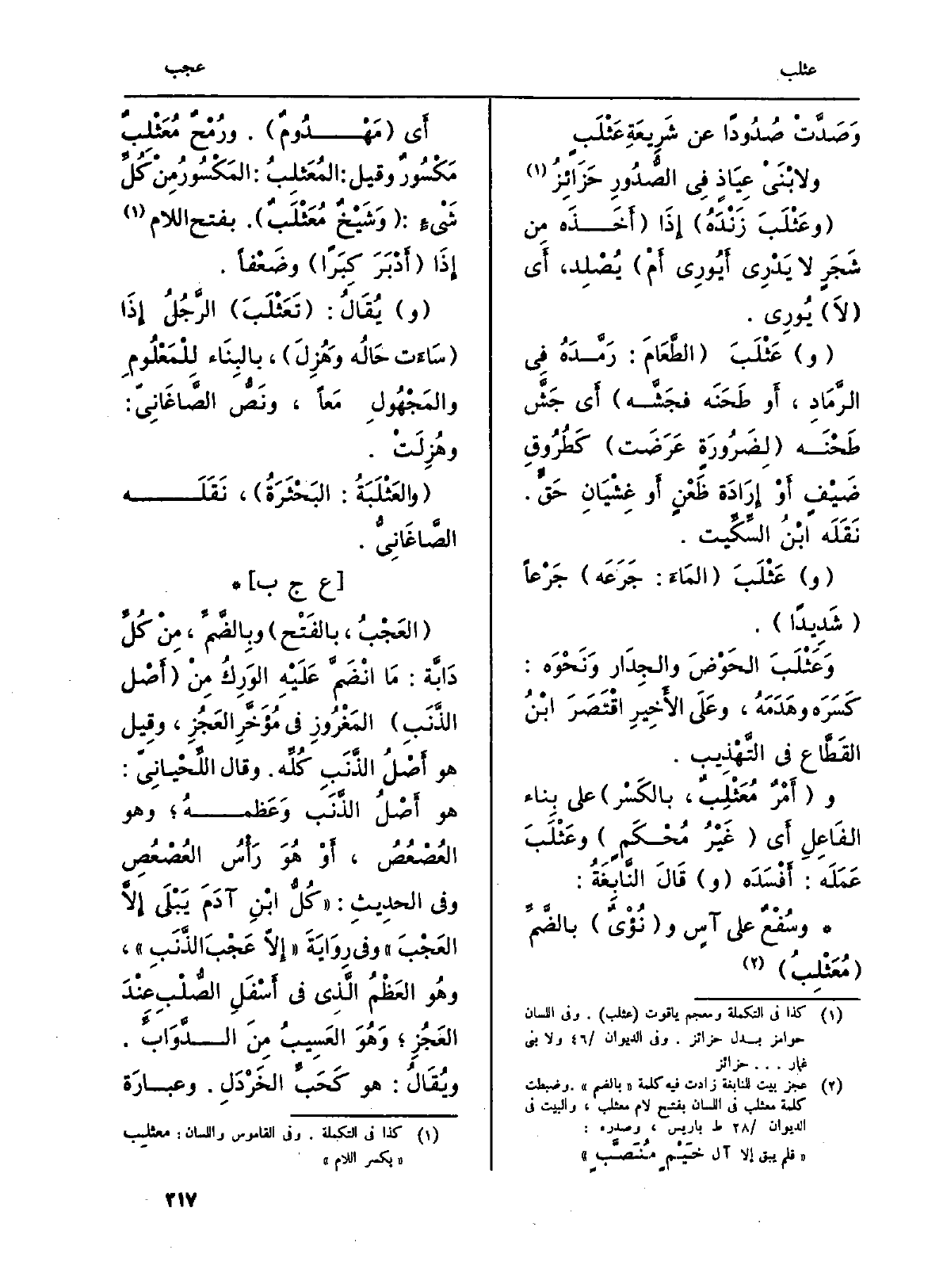 : (العَجْبُ، بالفَتْح) وبِالضَّمِّ، مِنْ كُلِّ دَابَّة: مَا انْضَمَّ عَلَيْهِ الوَرِكْ مِنْ (أَصْل الذَّنَبِ) المَغْرُوزِ فِي مُؤَخَّرِ العَجُزِ، وقِيل هُوَ أَصْلُ الذَّنَبِ كُلِّه. وَقَالَ اللِّحْيانِيّ: هُوَ أَصْلُ الذَّنَب وَعَظمهُ؛ وَهُوَ العُصْعُصُ، أَوْ هُوَ رَأْسُ العُصْعُصِ وَفِي الحدِيثِ: (كُلُّ ابْنِ آدَمَ يَبْلَى إِلَّا العَجْبَ) وَفِي رِوَايَةَ (إِلّا عَجْبَ الذَّنَبِ) ، وهُو العَظْمُ الَّذِي فِي أَسْفَلِ الصُّلْبِ عِنْدَ العَجُزِ؛ وَهُوَ العَسِيبُ مِنَ الدَّوَابِّ. ويُقَالُ: هُوَ كَحَبِّ الخَرْدَلِ. وعبارَة