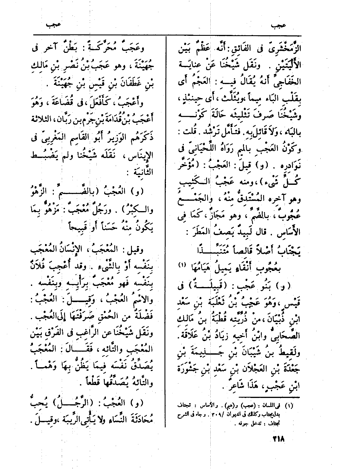 الزِّمَخْشَرِيّ فِي الفَائِقِ: أَنَّه عَظْمٌ بَيْن الأَلْيَتَيْنِ. ونَقَل شَيْخُنا عَنْ عِنايَة الخَفَاحِيِّ أَنهُ يُقَالُ فِيهِ: العَجْمُ أَي بِقَلْبِ البَاء مِيماً، ويُثَلَّث، أَي حِينئذٍ، وشَيْخُنَا صَرفَ تَثْلِيثَه حَالَةَ كَوْنهِ بالبَاء، وَلَا قَائِلَ بِهِ. فتَأَمَّل تَرْشُد. قُلت: وكَوْنُ العَجْبِ بالميمِ رَوَاهُ اللِّحْيَانِيّ فِي نَوَادِرِه. (و) قِيلَ: العَجْبُ: (مُؤَخَّر كُلِّ شَيْء) ، وَمِنْه عَجْبُ الكَثِيبِ وَهُوَ آخِره المُسْتَدِقُّ مِنْهُ، والجَمْعُ عُجُوبٌ، بالضَّمِّ، وَهُوَ مَجَزٌ، كَمَا فِي الأَسَاسِ. قَالَ لَبِيدٌ يَصِفُ المَطَرَ: