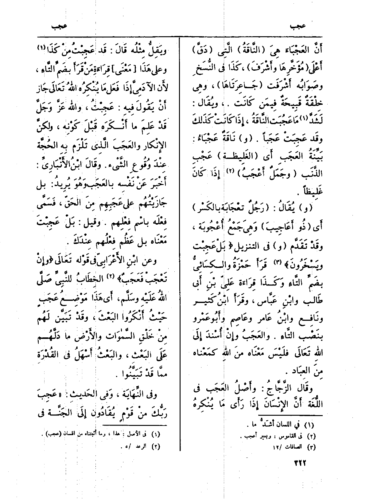 وَعَن ابْنِ الأَعْرَابِيّ فِي قَوْله تَعَالَى: {وَإِن تَعْجَبْ فَعَجَبٌ} (الرَّعْد: 5) الخِطَابُ للنَّبِيِّ صَلَّى اللهُ عَلَيهِ وسَلَّم، أَي هَذَا مَوْضِعُ عَجَبٍ حَيْثُ أَنْكَرُوا البَعْثَ، وقَدْ تَبَيَّن لَهُم مِنْ خَلْقِ السَّموَات والأَرْض مَا دَلَّهُم عَلَى البَعْث، والبَعْثُ أَسْهَلُ فِي القُدْرَةِ ممَّا قَدْ تَبَيَّنُوا.