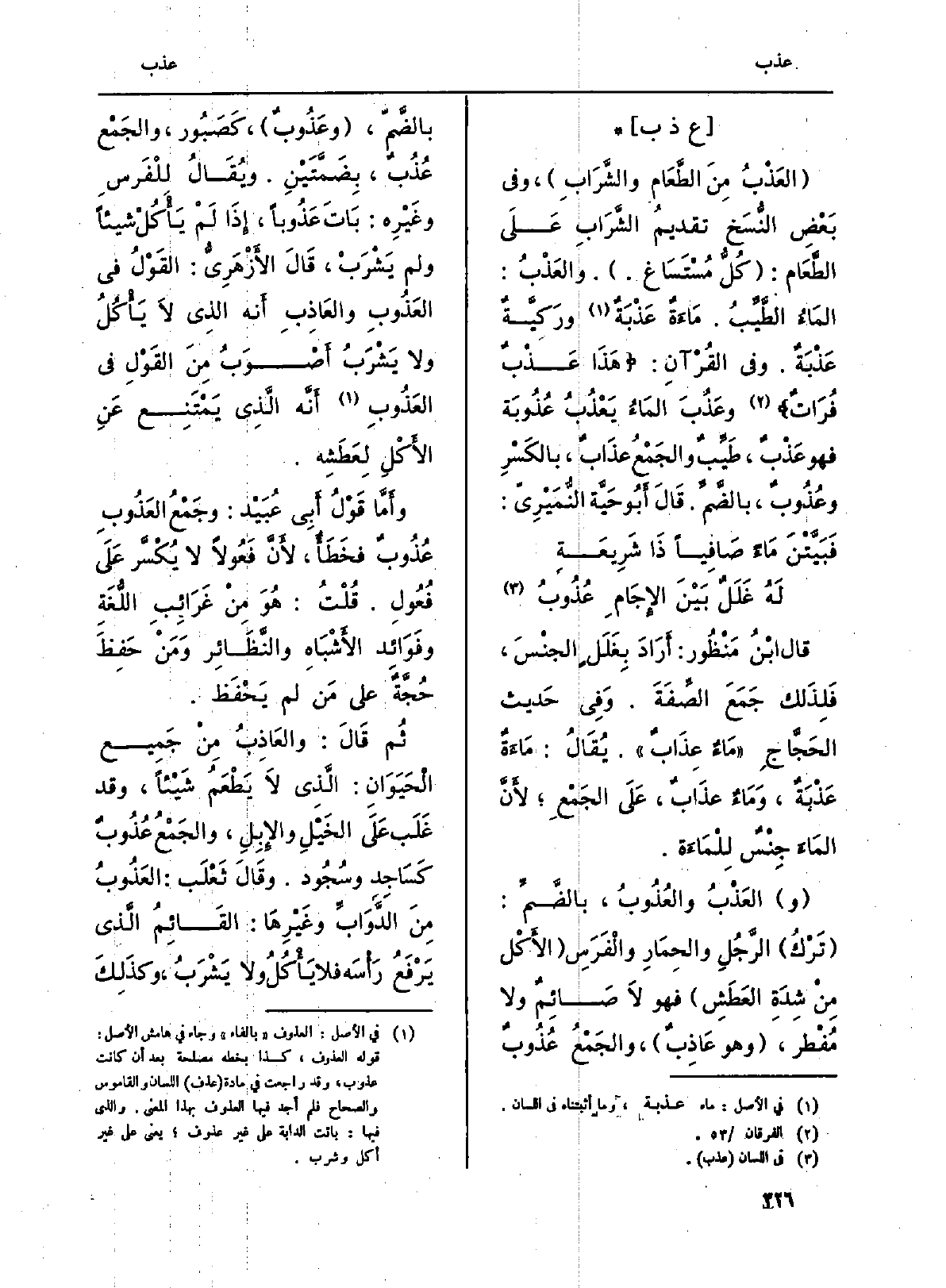وأَمَّا قَوْلُ أَبِي عُبَيْد: وجَمْعُ العَذُوبِ عُذُوبٌ فخَطَأٌ، لأَنَّ فَعُولاً لَا يُكْسَّر عَلَى فُعُول. قُلْتُ: هُوَ مِنْ غَرَائِبِ اللُّغَةِ وفَوَائِد الأَشبَاهِ والنَّظَائِر وَمَنْ حَفِظَ حُجَّةٌ على مَن لم يَحْفَظ.