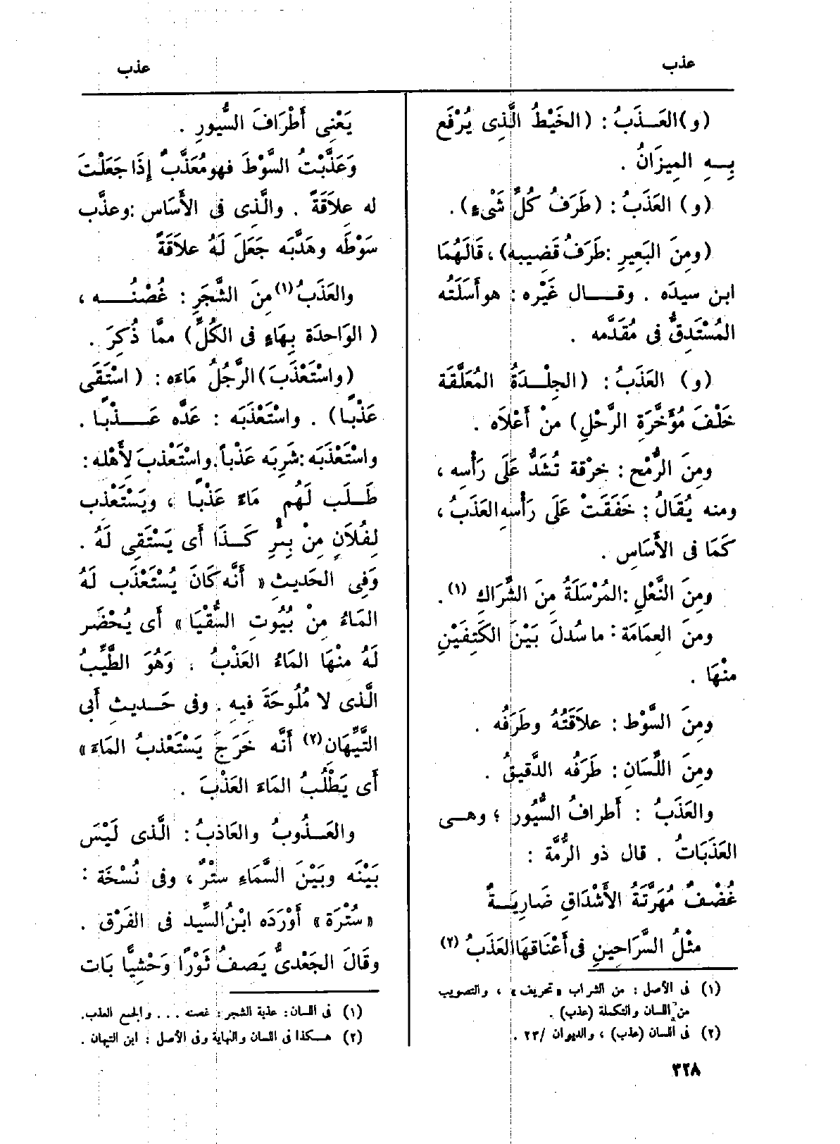 والعَذَبُ: أَطرافُ السُّيُور؛ وَهِي العَذَبَاتُ. قَالَ ذُو الرُّمَّة: