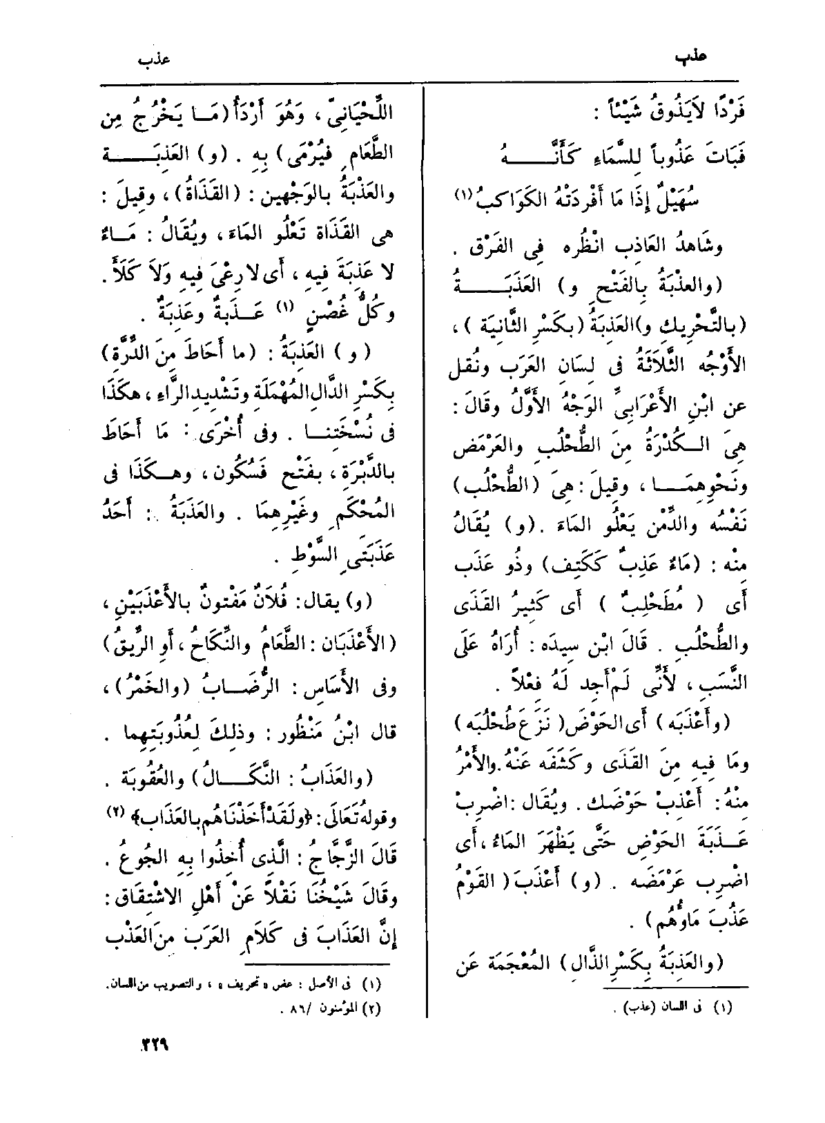 (و) يُقَال: فُلَانٌ مَفْتونٌ بالأَعْذَبَيْنِ، (الأَعْذَبَان: الطَّعَامُ والنِّكَاحُ، أَوِ الرِّيقُ) .