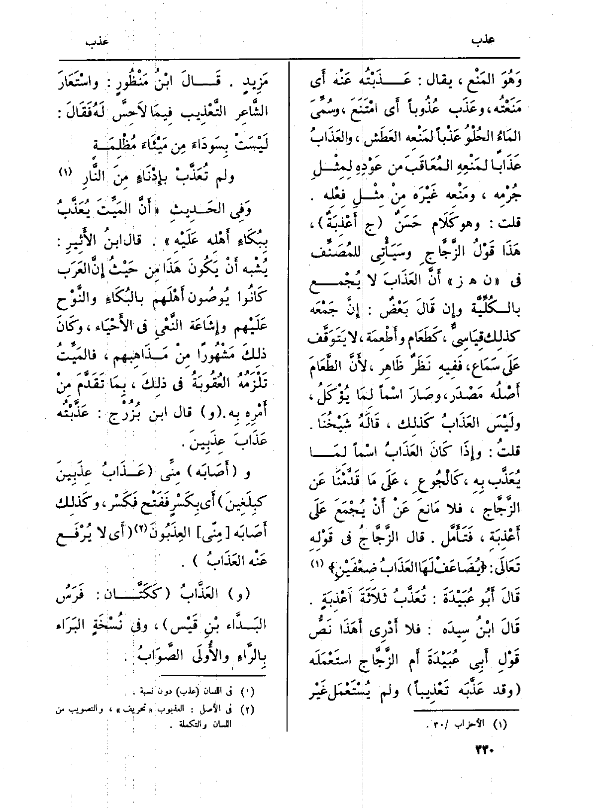 وَهُوَ المَنْع، يُقَال: عَذَبْتُه عَنْه أَي مَنَعْتُه، وعَذَب عُذُوباً أَي امْتَنَعَ، وسُمِّيَ المَاءُ الحُلْوُ عَذْباً لمَنْعِه العَطَش، والعَذَابُ عَذَاباً لمَنْعِهِ المُعَاقَبَ من عَوْدِهِ لِمِثْلِ جُرْمِه، ومَنْعِه غَيْرَه مِنْ مِثْلِ فِعْلِه. قلت: وَهُوَ كَلَام حَسَنٌ (ج أَعْذِبَةٌ) ، هَذَا قَوْلُ الزَّجَّاجِ وسَيَأْتِي للمُصَنِّف فِي (ن هـ ز) أَنَّ العَذَابَ لَا يُجْع بالكُلِّيَّة وإِن قَالَ بَعْضٌ: إِنَّ جَمْعَه كذلِك قِيَاسِيٌّ، كَطَعَام وأَطْعِمَة، لَا يَتَوَقَّف عَلَى سَمَاع، فَفِيهِ نَظَرٌ ظَاهِر، لأَنَّ الطَّعَامَ أَصْلُه مَصْدَر، وصَارَ اسْماً لِمَا يُؤْكَلُ، ولَيْسَ العَذَابُ كَذلِك، قَالَهُ شَيْخُنَا. قلتُ: وإِذَا كَانَ العَذَابُ اسْماً لِمَا يُعَذَّب بِهِ، كَالْجُوعِ، عَلَى مَا قَدَّمْنَا عَن الزَّجَّاج، فَلَا مَانعَ عَنْ أَنْ يُجْمَعَ عَلَى أَعْذِبَةِ، فَتَأَمَّل. قَالَ الزَّجَّاجُ فِي قَوْلِهِ تَعَالَى: {يُضَاعَفْ لَهَا الْعَذَابُ ضِعْفَيْنِ} (الْأَحْزَاب: 30) قَالَ أَبُو عُبَيْد: تُعَذَّبُ ثَلَاثَةَ أَعْذِبَةٍ. قَالَ ابْنُ سِيدَه: فَلَا أَدْرِي أَهَذَا نَصُّ قَوْلِ أَبِي عُبَيْدَةَ أَم الزَّجَّاج استَعْمَلَه (وَقد عَذَّبَه تَعْذِيباً) وَلم يُسْتَعْمَل غَيْر مَزِيدٍ. قَالَ ابْنُ مَنْظُورٍ: واسْتَعَارَ الشَّاعِر التَّعْذِيب فِيمَا لَا حِسَّ لَهُ فَقَالَ: