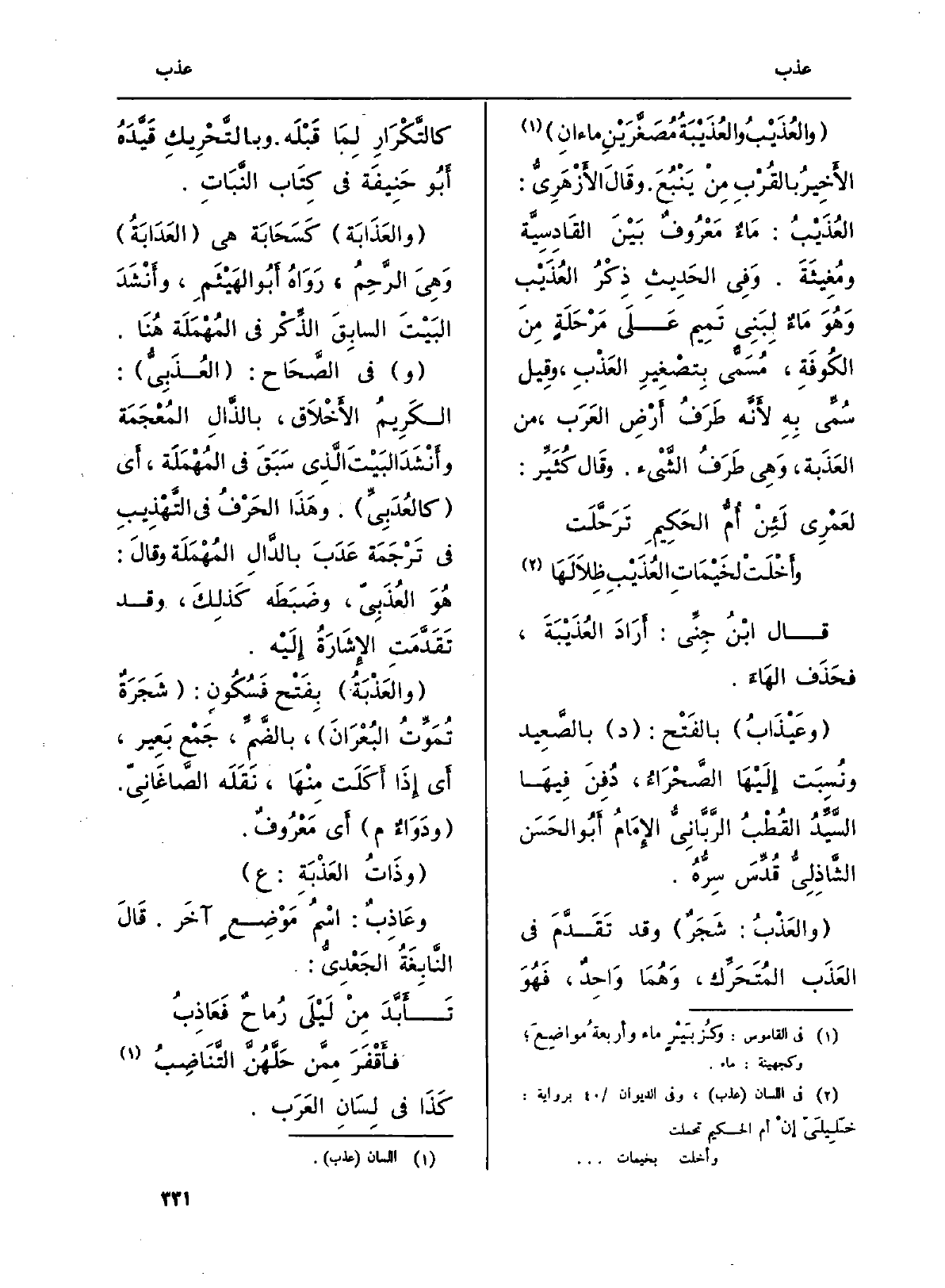 (والعُذَيْبُ والعُذَيْبَةُ مُصَغَّرَيْنِ ماءانِ) الأَخِيرُ بالقُرْبِ مِنْ يَنْبُعَ. وقَالَ الأَزْهَرِيُّ: العُذَيْبُ: مَاءٌ مَعْرُوفٌ بَيْنَ القَادِسِيَّة ومُغِيثَةَ. وَفِي الحَدِيثِ ذِكْرُ العُذَيْبِ وَهُوَ مَاءٌ لِبَنِي تَمِيم عَلَى مَرْحَلَةٍ مِنَ الكُوفَةِ، مُسَمًّى بِتصْغِيرِ العَذْبِ، وقِيل سُمِّي بِهِ لأَنَّه طَرَفُ أَرْضِ العَرَب، من العَذَبة، وَهِي طرَفُ الشَّيْء. وقَال كُثَيِّر: