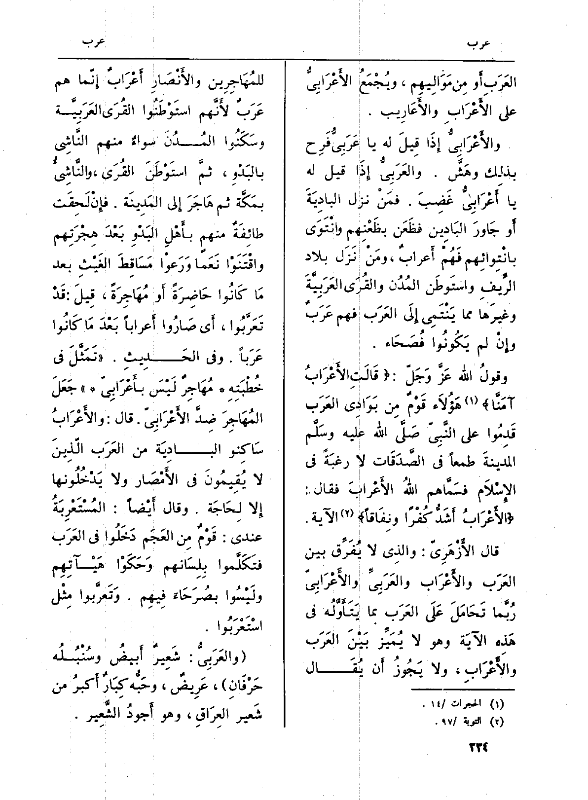 قَالَ الأَزْهَرِيّ: والذِي لَا يُفَرِّق بَين العَرَب والأَعْرَاب والعَرَبِيِّ والأَعْرَابِيّ رُبَّما تَحَامَلَ عَلَى العَرَب بِمَا يَتَأَوَّلُه فِي هَذِه الآيَة وَهُوَ لَا يُمَيِّز بَيْنَ العَرَب والأَعْرَابِ، وَلَا يَجُوزُ أَن يُقَال للمُهَاجِرِين والأَنْصَارِ أَعْرابٌ إِنما هم عَرَبٌ لأَنَّهم استَوْطَنُوا القُرَى العَرَبِيَّة وسَكَنُوا المُدُنَ سواءٌ مِنْهُم النَّاشِي بمَكَّة ثمَّ هَاجَرَ إِلى المَدِينَة. فإِنْ لَحِقَت طائِفَةٌ مِنْهُم بأهْله البَدْوِ بَعْدَ هِجْرَتِهم واقْتَنَوْا نَعَماً وَرَعوْا مَسَاقِطَ الغَيْثِ بعد مَا كَانُوا حَاضِرَةً أَو مُهَاجِرَةً، قِيلَ: قَدْ تَعَرَّبُوا، أَي صَارُوا أَعراباً بَعْدَ مَا كَانُوا عَرَباً. وَفِي الحَدِيث. (تَمَثَّلَ فِي خُطْبَتِهِ مُهَاجِرٌ لَيْسَ بأَعْرَابِيّ) جَعَلَ المُهَاجِرَ ضِدَّ الأَعْرَابِيّ. قَالَ والأَعْرَابُ سَاكِنو البادِيَة من العَرَب الّذِينَ لَا يُقِيمُونَ فِي الأَمْصَار وَلَا يَدْخُلُونها إِلا لِحَاجَة. وَقَالَ أَيْضاً: المُسْتَعْرِبَةُ عِنْدِي: قَوْمٌ مِن العَجَم دلُوا فِي العَرَب فتَكَلَّموا بِلِسَانهم وَحَكَوْا هَيْآتِهِم ولَيْسُوا بصُرَحَاءَ فِيهِم. وَتَعرَّبوا مِثْل اسْتَعْرَبُوا.