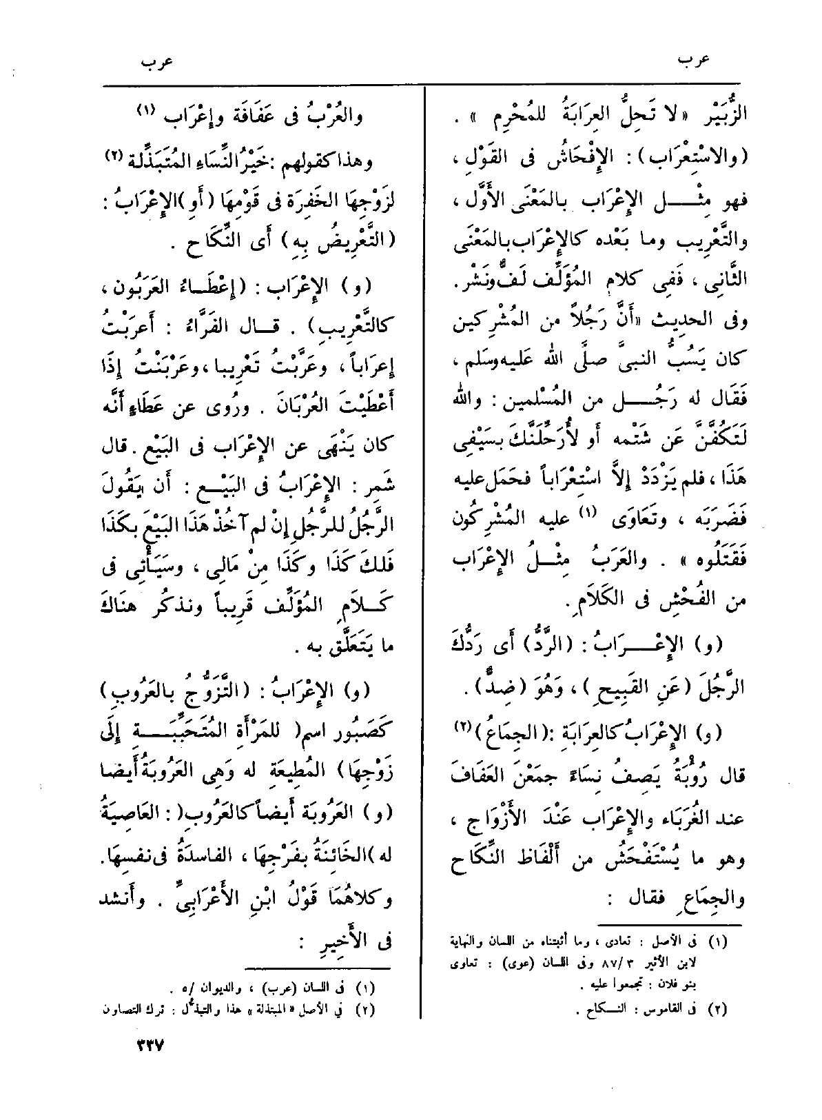 الزُّبَيْر (لَا تَحِلُّ العِرَابَةُ للمُحْرم) . (والاسْتِعرَاب) : الإِفْحَاشُ فِي القَوْلِ، فَهُوَ مِثْل الإِعْرَاب بالمَعْنَى الأَوَّل، والتَّعْرِيب وَمَا بَعْده كالإِعْرَاب بالمَعْنَى الثَّانِي، فَفِي كَلَام المُؤَلِّف لَفٌّ ونَشْر. وَفِي الحدِيث (أَنَّ رجُلاً من المُشْرِكين كَانَ يَسُبُّ النبيَّ صلَّى الله عَليه وسَلم، فَقَل لَهُ رَجُل من المُسْلمين: وَالله لَتَكُفَّنَّ عَن شَتْمه أَو لأُرَحِّلَنَّكَ بسَيْفِي هَذَا، فَلم يَزْدَدْ إِلَّا اسْتِعْرَاباً فحَمَل عَلَيْهِ فَضَرَبَه، وتَعَاوَى عَلَيْهِ المُشْرِكُون فَقَتَلُوه) . والعَرَبُ مِثْلُ الإِعْرَاب من الفُحْشِ فِي الكَلَامِ.