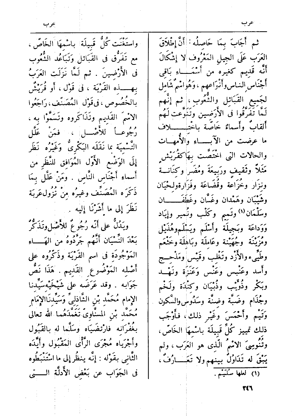ثمَّ أَجَابَ بِمَا حَاصِلُه: أَنَّ إِطْلَاقَ العَرَب عَلَى الجِيلِ المَعْرُوف لَا إِشْكَالَ أَنَّه قَدِيم كَغَيْرِهِ من أَسْمَاءِ بَاقِي أَجْنَاسِ النَّاس وأَنْوَاعهم، وَهُو اسْمٌ شَامِل لجَمِيع القَبَائِل والشُّعُوبِ، ثمَّ إِنَّهم لَمَّا تَفَرَّقُوا فِي الأَرَضِين وتَنَوَّعت لَهُم أَلقابٌ وأَسماءٌ خَاصّة باخْتِلاف مَا عرضت من الْآبَاء والأُمهات والحالات الَّتِي اخْتَصَّت بِهَا كقُرَيْشٍ مَثَلاً وثَقيفٍ ورَبِيعَةَ ومُضَر وكِنَانة ونِزَار وخُزَاعة وقُضَاعَة وفَزَارة ولِحْيَان وشَيْبَان وَهمْدان وغَسَّان وغَطَفَان وسَلْمَان وتَمِيم وكَلْب ونُمير وإِيَاد وَوَداعَة وبَجِيلَة وأَسْلَم ويَسْلَم وهُذَيْل ومُزَيْنَة وجُهَيْنة وعَامِلَة وبَاهِلَة وخَثْعَم وطَيِّىء والأَزْد وتَغْلِب وقَيْس ومَذْحِج وأَسد وعَنْبس وعَنْس وَعَنَزَة ونَهْد وبَكْر وذُؤَيْب وذُبْيَان وكِنْدَة ولَخْم وجُذَام وضَبَّة وضِنَّة وسَدُوس والسَّكون وَتَيْم وأَحْمَسَ وغَيْرِ ذَلِك، فأَوْجَب ذلِك تَمْيِيز كُلِّ قَبِيلَة باسْمِهَا الخَاصّ، وتُنُوسِيَ الاسْمُ الّذِي هُوَ العَرَب، وَلم يَبْقَ لَهُ تَدَاوُلٌ بَينهم وَلَا تَعَارُفٌ، واستَغْنَت كُلُّ قَبِيلَة باسْمِهَا الخَاصّ، مَعَ تَفَرُّق فِي القَبَائل وَتَبَاعُد الشُّعُوب فِي الأَرْضِينَ. ثمَّ لَمَّا نَزَلَت العَرَبُ بِهذِه القَرْيَة، فِي قَوْل، أَو قُرَيْشٌ بالخُصُوص، فِي قَوْل المُصَنّف، رَاجَعُوا الاسْمَ القَدِيم وتَذَاكَروه وتَسَموُا بِه، رُجُوعاً للأَصْل، فمَنْ عَلَّل التَّسْمِيَة بِمَا نَقَله البَكْرِيُّ وَغَيْرُه نَظَر إِلَى الوَضْع الأَوّل المُوَافِق للنَّظَرِ من أَسماءِ أَجْنَاسِ النَّاسِ. ومَنْ عَلَّل بِمَا ذَكَرَه المُصَنِّف وغيرُه مِنْ نُزُول عَربَة نَظَرَ إِلى مَا أَشَرْنَا إِليه.