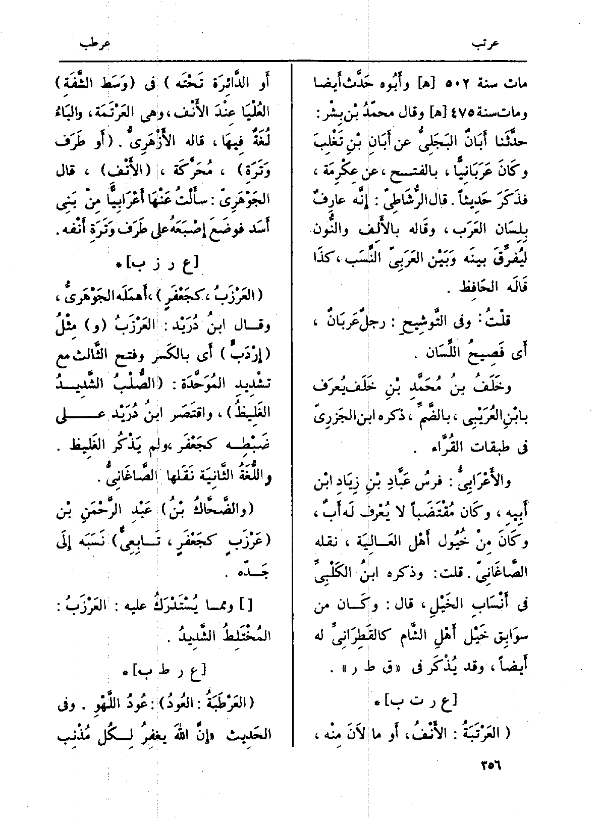 مَاتَ سنة 502 هـ وأَبُوه حَدَّث أَيضاً وَمَات سنة 475 هـ وَقَالَ محمّدُ بْنِ بِشْر: حدَّثنا أَبَانٌ البَجَلِيُّ عَن أَبَانه بْنِ تَغلِبَ وكَانَ عَرَبَانِيًّا، بِالْفَتْح، عَن عِكْرِمَة، فذَكَرَ حَدِيثاً. قَالَ الرُّشَاطِيّ: إِنَّه عارِفٌ بِلِسَان العَرَب، وقَاله بالأَلِف والنُّون ليُفرِّقَ بينَه وَبَيْن العَرَبِيّ النَّسَب، كذَا قَالَه الحَافِظ.