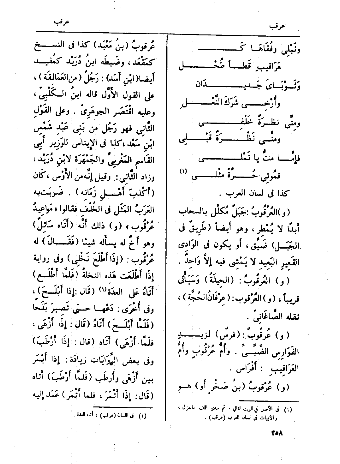 (و) عُرقُوبٌ: (فرسٌ) لزيدِ الفَوَارِسِ الضَّبِّيِّ. وأُمُّ عُرْقُوبٍ وأُمُّ العَرَاقِيبِ: أَفْرَاسُ عُرْقوبُ (بنُ صَخْرٍ أَو) هُوَ عُرقوبُ (بنُ مَعْبد) كَذَا فِي النّسخ كمَقْعَد، وضَبطَه ابنُ دُرَيْد كمُفيد أَيضاً (ابْنِ أَسَد) : رَجُلٌ (من العَمَالِقَة) ، على القَوْل الأَوَّل قَالَه ابنُ الكَلْبِيّ، وَعَلِيهِ اقْتَصَر الجوهَرِيّ. وعَلى القَوْلِ الثَّانِي فَهُوَ رَجُل من بَنِي عَبْدِ شَمْسِ بْنِ سَعْد، كَذَا فِي الإِيناس للوَزِير أَبِي القَاسم المَغْربِيِّ، والجَمْهَرَة لابْنِ دُرَيْد، وَزَاد الثَّانِي: وَقيل إِنَّه من الأَوْس، كَان (أَكْذبَ أهْلِ زَمَانِه) . ضَربَت بِهِ العَرَبُ المَثَل فِي الخُلْفِ فَقَالُوا (مَواعِيدُ عُرْقُوب) (و) ذَلِك أَنَّه (أَتَاه سَائِلٌ) وَهُوَ أَخٌ لِيسأَله شَيْئا (فَقَالَ) لَهُ عُرْقُوب: (إِذَا أَطْلَعَ نَخْلِي) وَفِي رِوَايَة إِذَا أَطْلَعَت هَذِه النخلةُ (فَلمَّا أَطْلَع) أَتَاهُ عَلى العدَة (قَال: إِذا أَبْلَحَ) ، وَفِي أُخْرَى: دَعْها حَتَّى تَصِيرَ بَلَحاً (فَلَمَّا أَبْلَحَ) أَتَاهُ (قَال: إِذَا أَزْهَى، فلَمَّا أَزْهَى) أَتَاه (قَالَ: إِذَا أَرْطَبَ) وَفِي بعض الرِّوَايَات زيادَة: إِذا أَبْسَر بَين أَزْهَى وأَرطَب (فَلمَّا أَرْطَبَ) أَتاه (قَال: إِذَا أَتْمَرَ، فَلَمَّا أَتْمَر) عَمَد إِليه