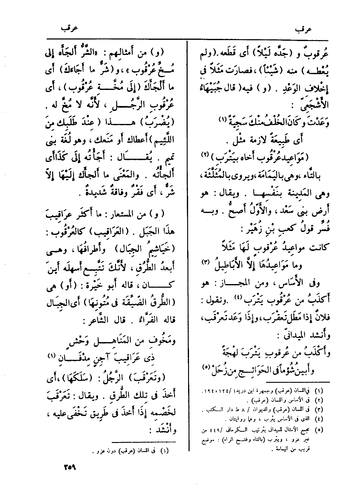 (و) من الْمُسْتَعَار: مَا أكثَر عرَاقِيبَ هذَا الجَبَل. (العَرَاقِيب) كالعُرْقُوب: (خَيَاشِيمُ الجِبَال) وأَطرافُهَا، وَهِي أَبعدُ الطُّرُقِ، لأَنَّكَ تَتَّبِع أَسهلَه أَينَ كَانَ، قَالَه أَبو خَيْرة: (أَو) هِيَ (الطُّرقُ الضُّيِّقَة فِي مُتُونِهَا) أَي الجِبَال قَالَه الفَرَّاءُ. قَالَ الشَّاعر: