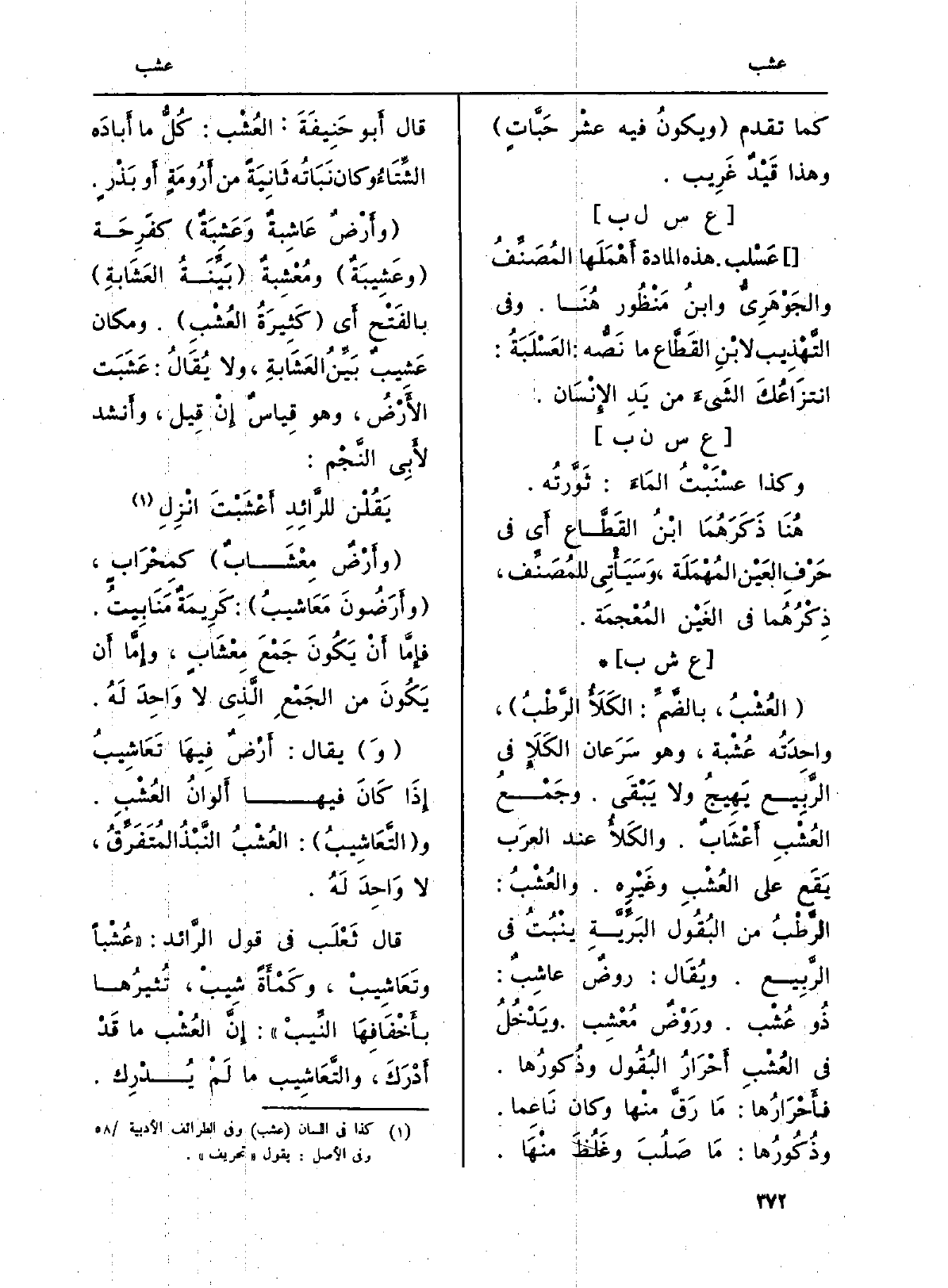 : (العُشْبُ، بالضَّمِّ: الكَلَأُ الرَّطْبُ) ، واحِدَتُه عُشْبة، وَهُوَ سَرَعان الكَلَإِ فِي الرَّبِيع يَهِيجُ وَلَا يَبْقَى. وجَمْعُ العُشْبِ أَعْشَابٌ. والكَلأُ عِنْد العرَب يَقَع على العُشْبِ وغَيْرِه. والعُشْبُ: الرَّطْبُ من البُقُول البَرِّيَّةِ ينْبُتُ فِي الرَّبِيع. ويُقَال: روضٌ عاشِبٌ: ذُو عُشْب. ورَوْضٌ مُعْشِب ويَدْخُلُ فِي العُشْبِ أَحْرَارُ البُقُول وذُكورُها. فأَحْرَارُها: مَا رَقَّ منْها وَكَانَ نَاعِماً. وذُكُورُها: مَا صَلُبَ وغَلُظَ منْهَا. قَالَ أَبو حَنِيفَةَ: العُشْب: كُلُّ مَا أَبادَه الشِّتَاءُ وَكَانَ نَبَاتُه ثَانِيَةً من أَرُومَةٍ أَو بَذْرٍ.