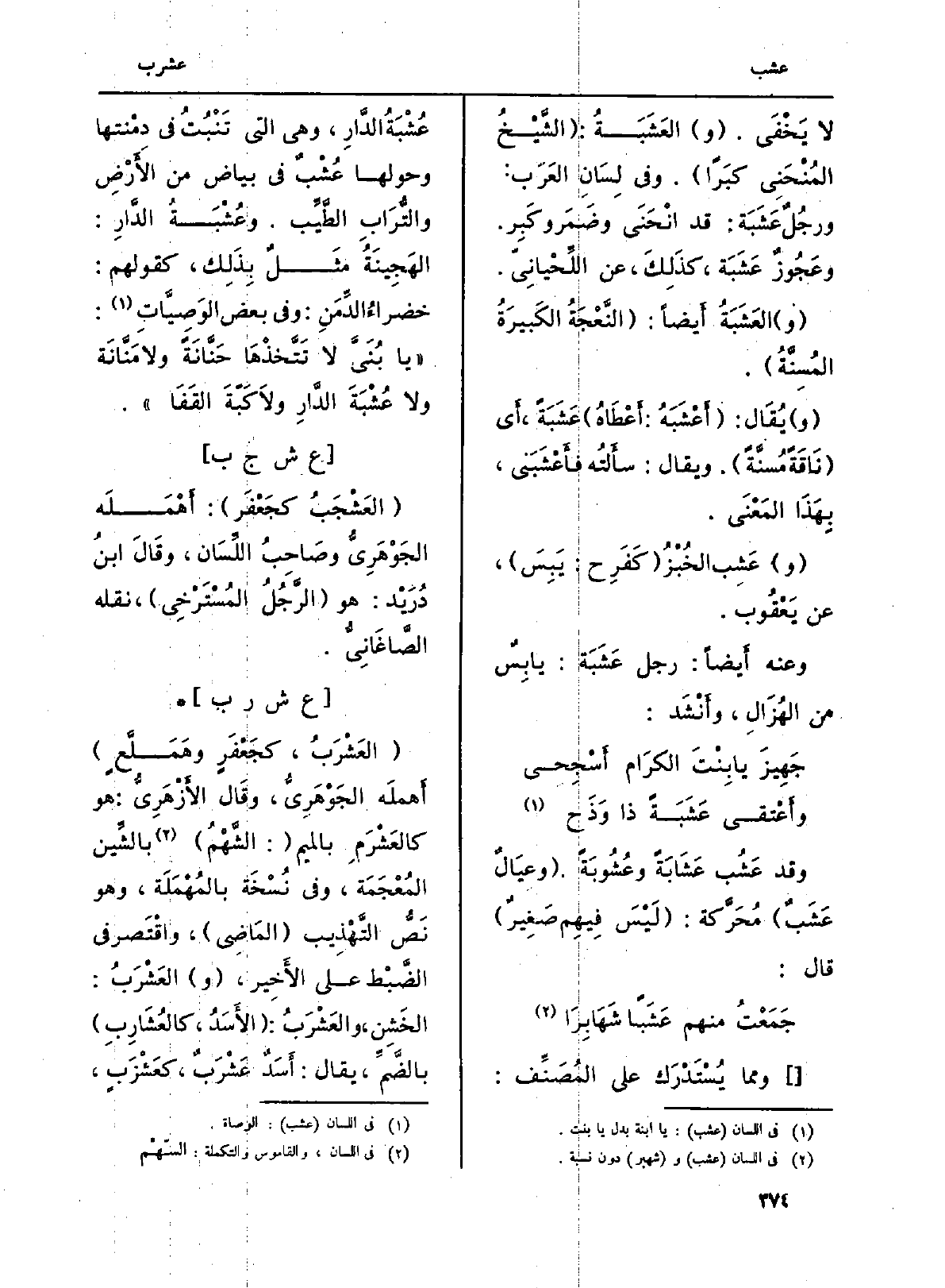 لَا يَخْفَى. (و) العَشَبَةُ: (الشَّيْخُ المُنْحَنى كبَراً) . وَفِي لِسَان العَرَب: ورجُلٌ عَشَبَة: قد انْحَنَى وضَمَر وكَبِر. وعَجُوزٌ عَشَبَة، كذَلِكَ، عَن اللِّحْيانِيّ.
