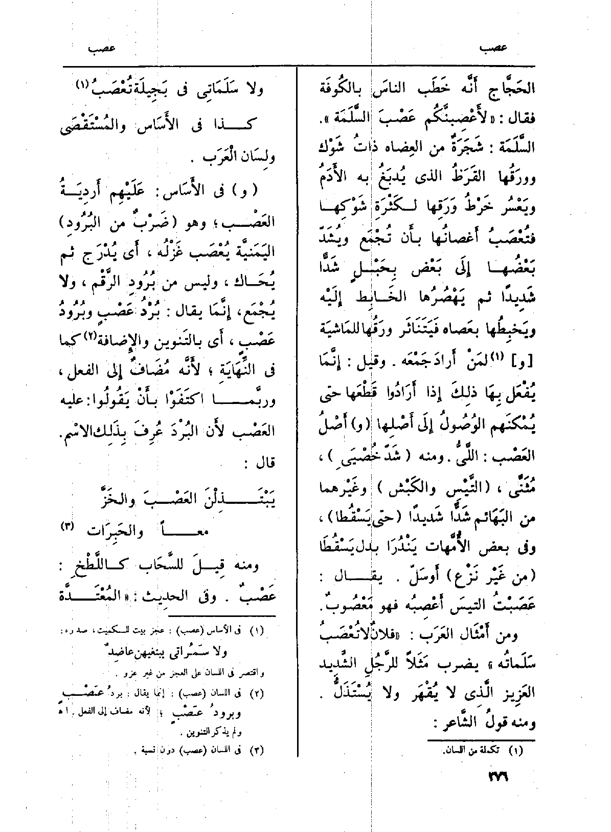الحَجَّاج أَنَّه خَطَب الناسَ بالكُوفَة فَقَالَ: (لأَعْصِبنَّكُم عَصْبَ السَّلَمَة) . السَّلَمَة: شَجَرَة من العِضاه ذاتُ شَوْك وورَقُها القَرَظُ الَّذِي يُدبَغُ بِهِ الأَدَمُ ويَعْسُر خَرْطُ وَرَقِها لكَثْرَةِ شَوْكِها فتُعْصبُ أَغصانُها بأَن تُجْمَع ويُشَدّ بَعْضُها إِلَى بَعْض بِحَبْلٍ شَدًّا شَدِيداً ثمَّ يَهْصُرُها الخَابِط إِلَيْه ويَخبِطُها بعَصاه فَيَتَنَاثَر ورَقُها للمَاشيَة (و) لمَنْ أَرادَ جَمْعَه. وَقيل: إِنَّمَا يُفْعَل بِهَا ذلِكَ إِذا أَرَادُوا قَطْعَها حَتَّى يُمْكنَهم الوُصُولُ إِلَى أَصْلِها (و) أَصْلُ العَصْب: اللَّيُّ. وَمِنْه (شَدّ خُصْيَي) ، مُثَنَّى، (التَّيْسِ والكَبْش (وغَيْرها من البَهَائم شَدًّا شَديداً (حَتَّى يَسْقُطا) ، وَفِي بعض الأُمَّهات يَنْدُرَا بدل يَسْقُطَا (من غَيْر نَزْع) أَوسَلّ. يُقَال: عَصَبْتُ التيسَ أَعْصبُه فَهُوَ مَعْصُوبٌ.