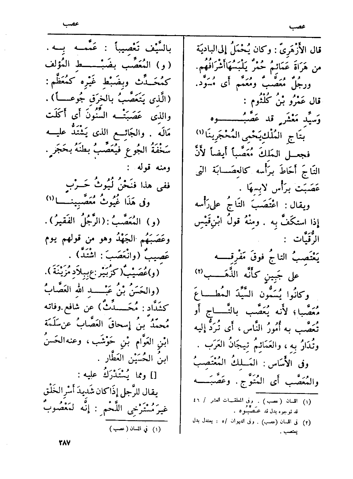 وكانُوا يُسَمُّون السَّيِّدِ المُطَاعَ مُعَصَّبا؛ لأَنه يُعَصَّب بالتَّاج أَو تُعَصَّب بِهِ أُمُورُ النَّاس، أَي تُرَدُّ إِليه وتُدَارُ بِهِ، والعَمَائِمُ تِيجَانُ العَرَب.