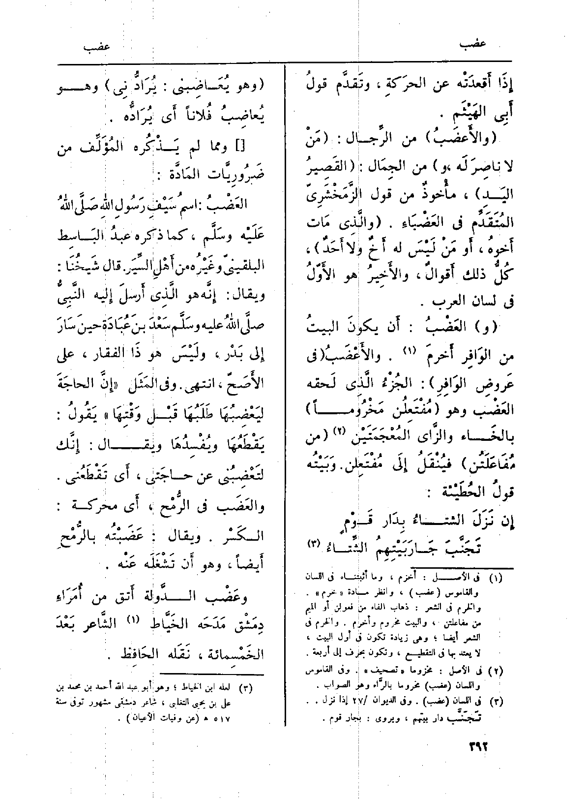 (و) العَضْبُ: أَن يكونَ البيتُ من الوَافِر أَخرمَ. الأَعْضَبُ (فِي عَروضِ الوَافِره) : الجُزْءُ الَّذِي لَحقه العَضْب وَهُوَ (مُفْتَعِلُن مَخْرُوماً) بالخَاء والزَّاي المُعْجَمَتَيْن (من مُفَاعَلَتُن) فيُنْقَلُ إِلَى مُفْتَعِلن. وَبَيْتُه قولُ الحُطَيْئة: