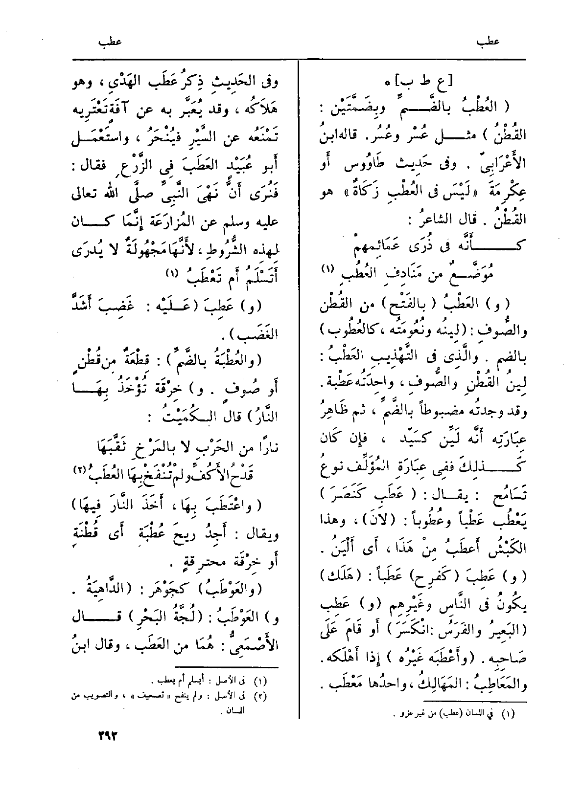 : (العُطْبُ بالضَّمِّ وبِضَمَّتَيْن: القُطْنُ) مثل عُسْر وعُسُر. قَالَه ابنُ الأَعْرَابِيّ. وَفِي حَدِيث طَاوُوس أَو عِكْرِمَةَ (لَيْسَ فِي العُطْبِ زَكَاةٌ) هُوَ القُطْنُ. قَالَ الشاعرُ: