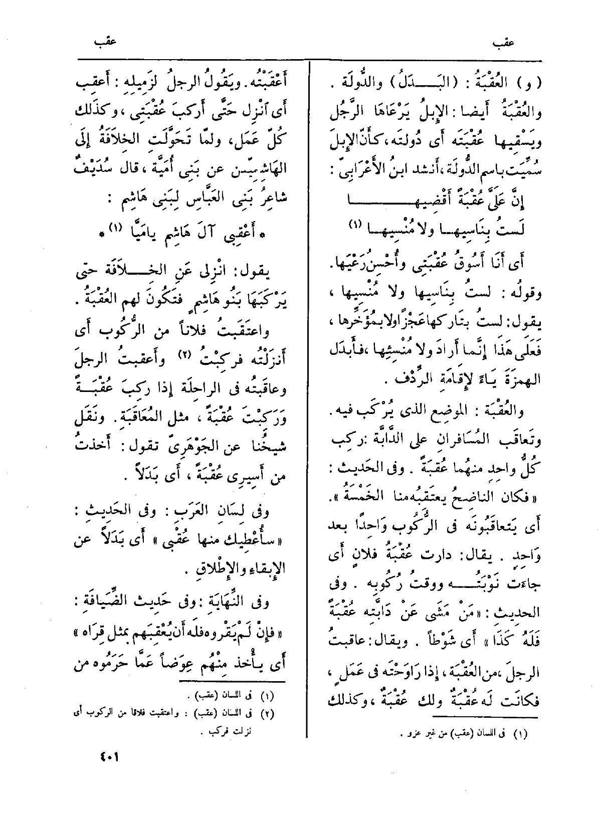 والعُقْبَة: الموضِع الَّذِي يُرْكَب فِيهِ. وتَعاقَب المُسَافرانِ على الدَّابَّة: ركِب كُلُّ واحِدٍ منهُما عُقبَةً. وَفِي الحَدِيث: (فَكَانَ الناضِحُ يعتَقِبُه منا الخَمْسَةُ) . أَي يَتعاقَبُونَه فِي الرُّكُوب وَاحِداً بعد وَاحِدٍ. يُقَال: دارت عُقْبَةُ فلانٍ أَي جاءَت نَوْبَتُه ووقتُ رُكُوبِه. وَفِي الحَدِيثِ: (مَنْ مَشَى عَنْ دَابَّتِه عُقْبَةً فعلَهُ كَذَا) أَي شَوْطاً. وَيُقَال: عاقبتُ الرجلَ، من العُقْبَة، إِذا رَاوَحْتَه فِي عَمَلٍ، فكانَت لَه عُقْبَةٌ وَلَك عُقْبَةٌ، وَكَذَلِكَ أَعقَبْتُه. ويَقُولُ الرجلُ لزَمِيلِهِ: أَعقِب أَي انْزِل حَتَّى أَركبَ عُقْبَتِي، وكذَلك كُلّ عَمَل، ولمّا تَحَوَّلَتِ الخِلَافَةُ إِلَى الهَاشِمِيّين عَن بَنِي أُمَيَّة، قَالَ سُدَيْفٌ شاعِرُ بَنِي العَبَّاسِ لِبَنِي هَاشِم: