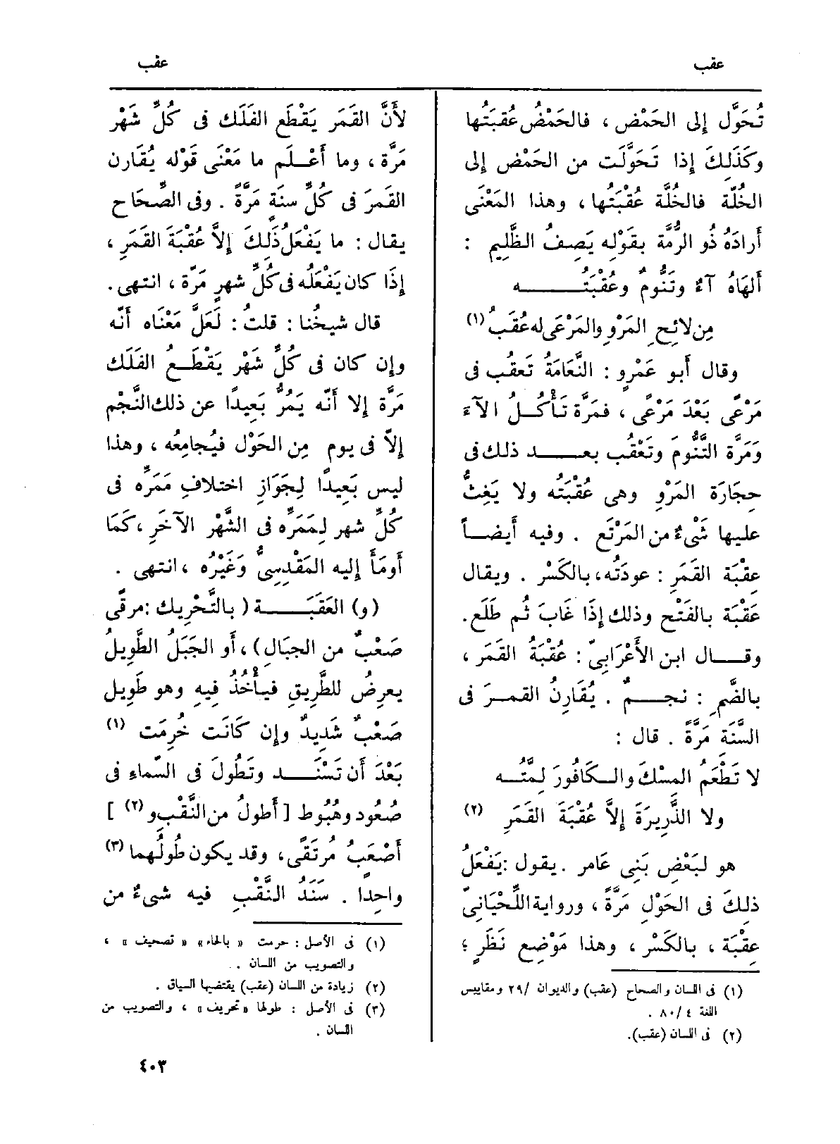 وَقَالَ أَبو عَمْرٍ و: النَّعَامَةُ تَعقُب فِي مَرْعًى بَعْدَ مَرْعًى، فمَرَّة تَأْكُلُ الآءَ وَمَرَّة التَّنُّومَ وتَعْقُب بعد ذَلِك فِي حِجَارَة المَرْوِ وَهِي عُقْبَتُه وَلَا يَغِثُّ عَلَيْهَا شَيْءٌ من المَرْتَع. وَفِيه أَيضاً عِقْبَة القَمَرِ: عودَتُ، بالكَسْر. وَيُقَال عَقْبَة بالفَتْح وَذَلِكَ إِذَا غَاب 2 ثُم طَلَع. وَقَالَ ابْن الأَعْرَابِيّ: عُقْبَةُ القَمَر، بالضَّمِ: نجمٌ. يُقَارِنُ القمرَ فِي السَّنَة مَرَّةً. قَالَ: