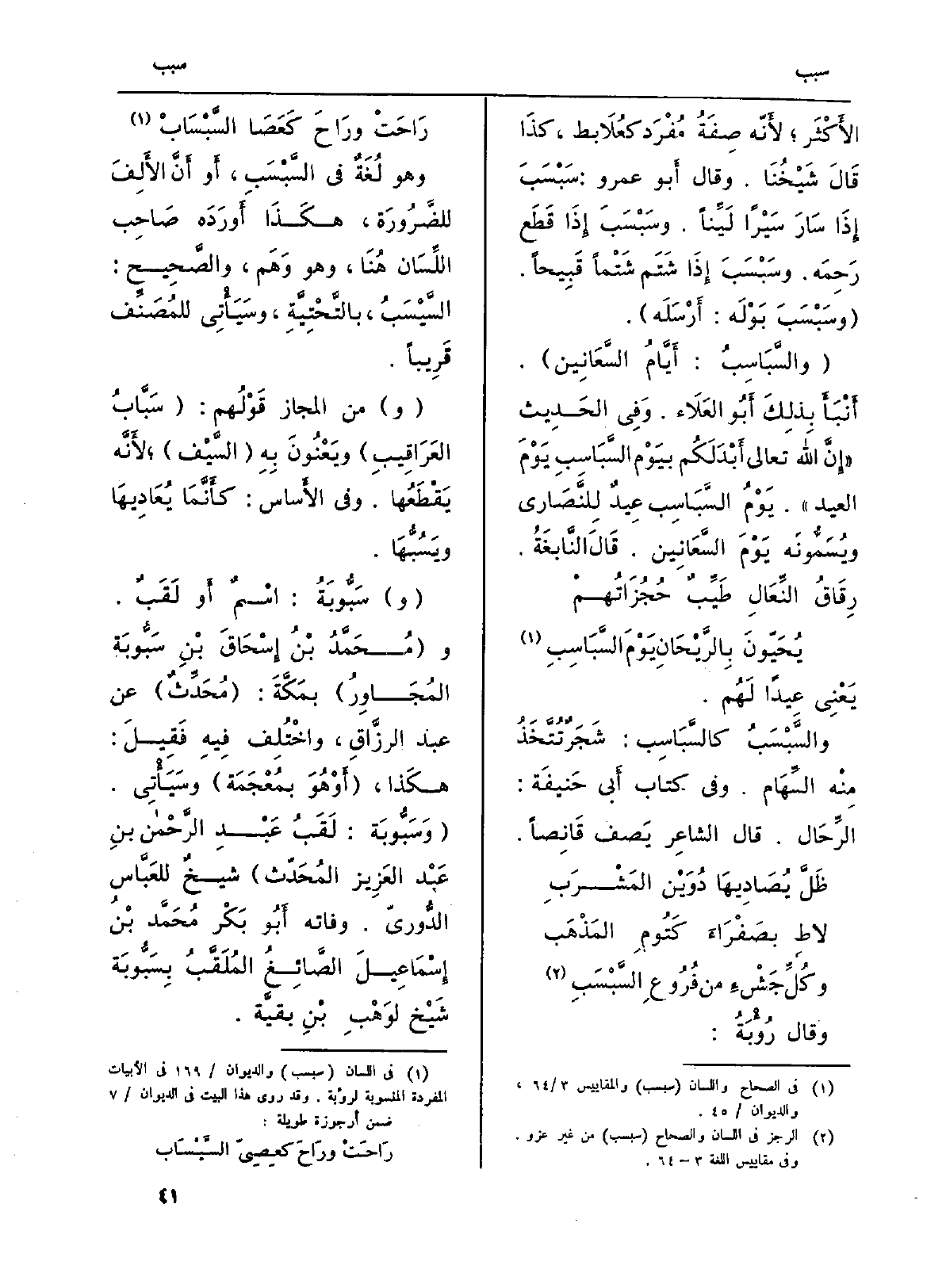 (والسَّبَاسِبُ: أَيَّامُ السَّعَانِين) . أَنْبَأَ بِذلِكَ أَبُو العَلَاء. وَفِي الحَدِيث (إِنَّ الله تَعَالَى أَبْدَلَكُم بيَوْم السَّبَاسِبِ يَوْمَ الْعِيد) . يَوْمُ السَّبَاسِب عِيدٌ للِنَّصَارى ويُسَمُّونَه يَوْمَ السَّعَانِين. قَالَ النَّابغَةُ: