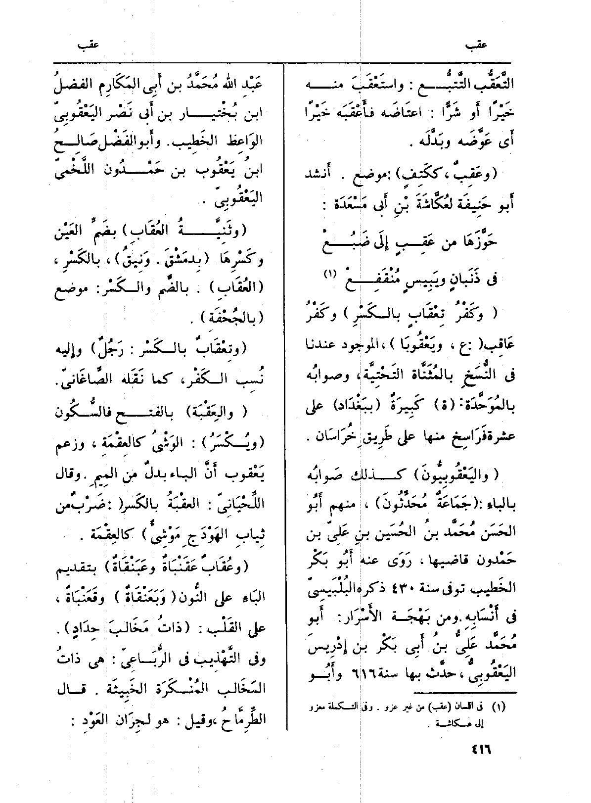 (وكَفْرُ تِعْقَابٍ بالكَسْرِ) وَكَفْرُ عَاقِب: (ع، ويَعْقُوبَا) ، الْمَوْجُود عندنَا فِي النُّسَخِ بالمُثَنَّاة التَحْتِيَّة، وصوابُه بالمُوَحَّدَة: (ة) كَبِيرَةٌ (ببَغْدَاد) على عشرَة فَرَاسِخ مِنْهَا على طَرِيقِ خُرَاسَان.