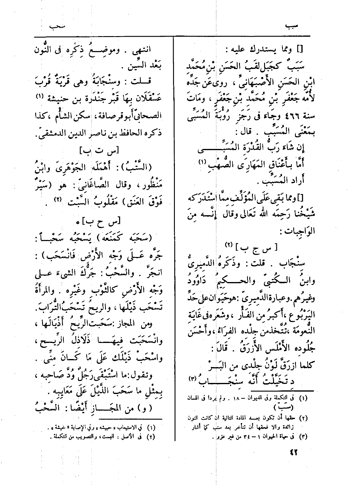 : (سِنْجَاب. قلت: وذَكَرهُ الدَّمِيرِيُّ وابنُ الكُتبيّ والحكِيُ دَاوُودُ وغيرُهم. وَعبارَة الدَّمِيرِيّ: هُوَ حَيَوان على حَدِّ اليَرْبُوع، أَكبرُ مِن الفَأْر، وشَعَره فِي غَايَةِ النُّعومَة، تُتَّخذ من جِلْدِه الفِرَاءُ، وأَحْسَن جُلُودِه الأَمْلَس الأَزرَقُ. قَالَ: