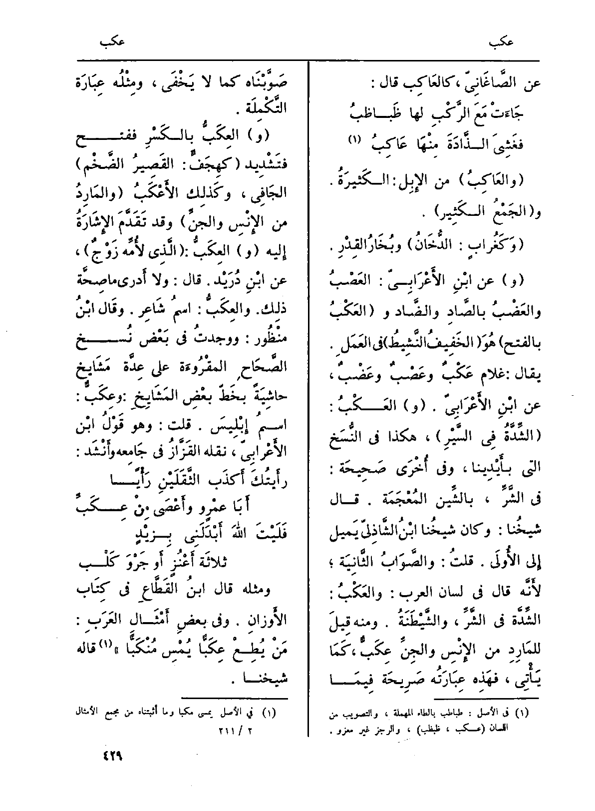 وَمثله قَالَ ابنُ القطاعِ فِي كِتَاب الأَوزانِ. وَفِي بعضِ أَمْثَالِ العَرَبِ: مَنْ يُطِعْ عِكَبًّا يُمْسِ مُنْكَبًّا) قَالَه شَيخنَا.