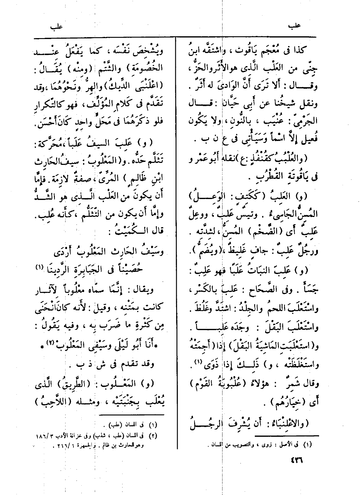 (و) عَلِبَ السيفُ عَلَباً، مُحَرَّكة: تَثَلَّم حَدُّه. و (المَعْلُوبُ: سيف الحَارِث بْنِ ظَالِمٍ) المُرِّيّ، صفةٌ لازِمَة. فإِمَّا أَن يكونَ من العَلْب الَّذي هُوَ الشَّدُّ وإِمَّا أَن يكون من التّثَلُّم، كأَنه عُلِب. قَالَ الكُمَيْتُ:
