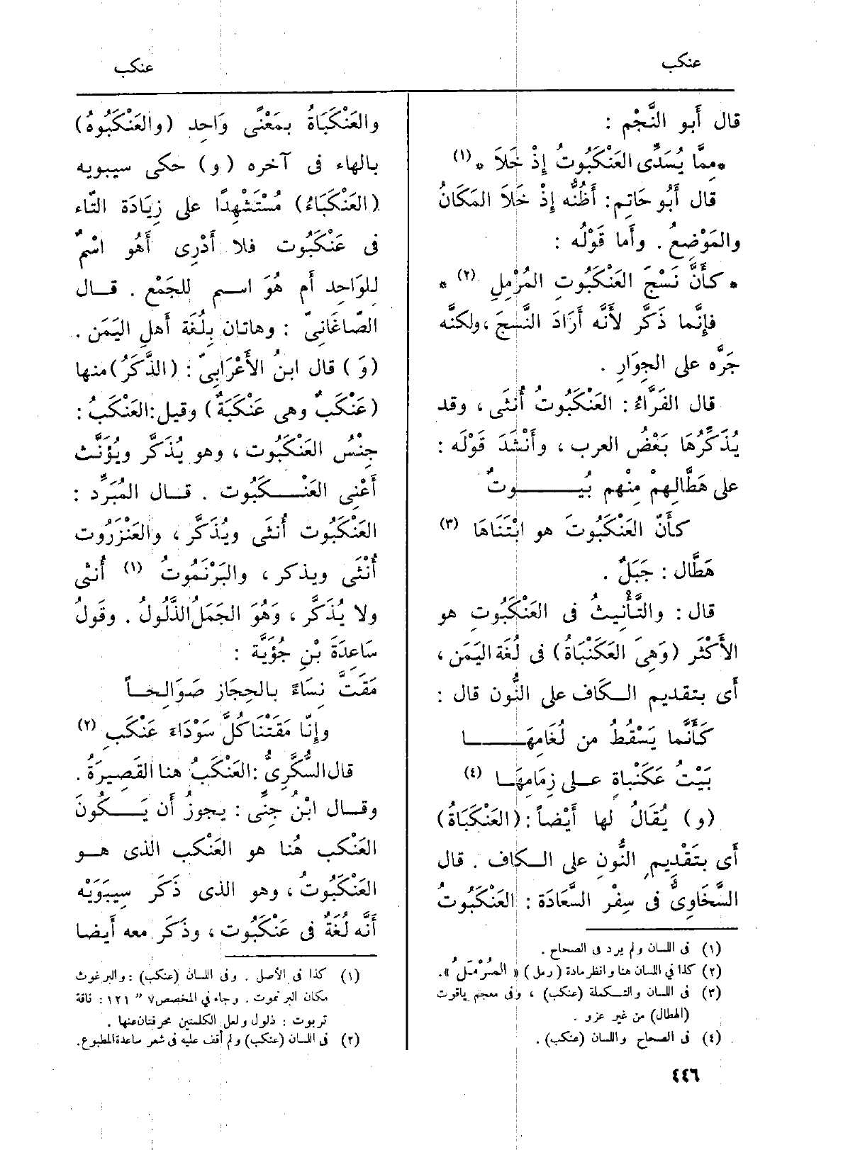 قَالَ: والتَّأْنِيثُ فِي العَنْكَبُوتِ هُوَ الاكْثَر (وَهِيَ العَكَنْبَاةُ) فِي لُغَة اليَمَن، أَي بِتَقْدِيم الكَاف على النُّون قَالَ: