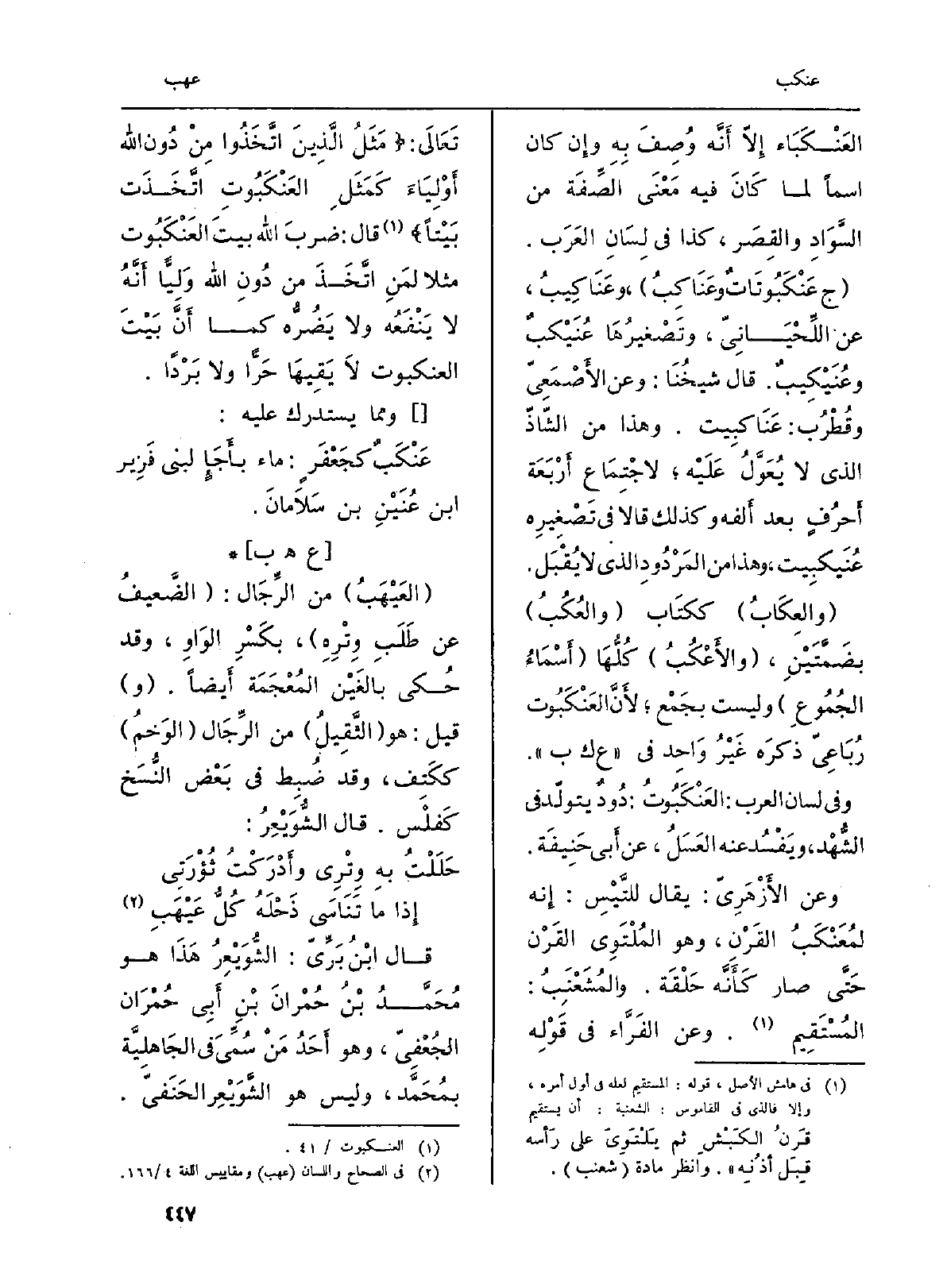 وَعَن الأَزْهَرِيّ: يُقَال للتَّيْسِ: إِنه لمُعَنْكَبُ القَرْنِ، وَهُوَ المُلْتَوِي القَرْن حَتَّى صَار كَأَنَّه حَلْقَة. والمُشَعْنَبُ: المُسْتَقِيم. وَعَن الفَرَّاء فِي قَوْلِه تَعَالَى: {مَثَلُ الَّذِينَ اتَّخَذُواْ مِن دُونِ اللَّهِ أَوْلِيَآء كَمَثَلِ الْعَنكَبُوتِ اتَّخَذَتْ بَيْتاً} (العنكبوت: 41) قَالَ: ضربَ الله بيتَ العَنْكَبُوت مثلا لمَنِ اتَّخَذَ من دُونِ الله وَلِيًّا أَنَّهُ لَا يَنْفَعُ وَلَا يضُرُّه كَمَا أَنَّ بَيْتَ العنكبوت لَا يَقِيهَا حَرًّا وَلَا بَرْداً.