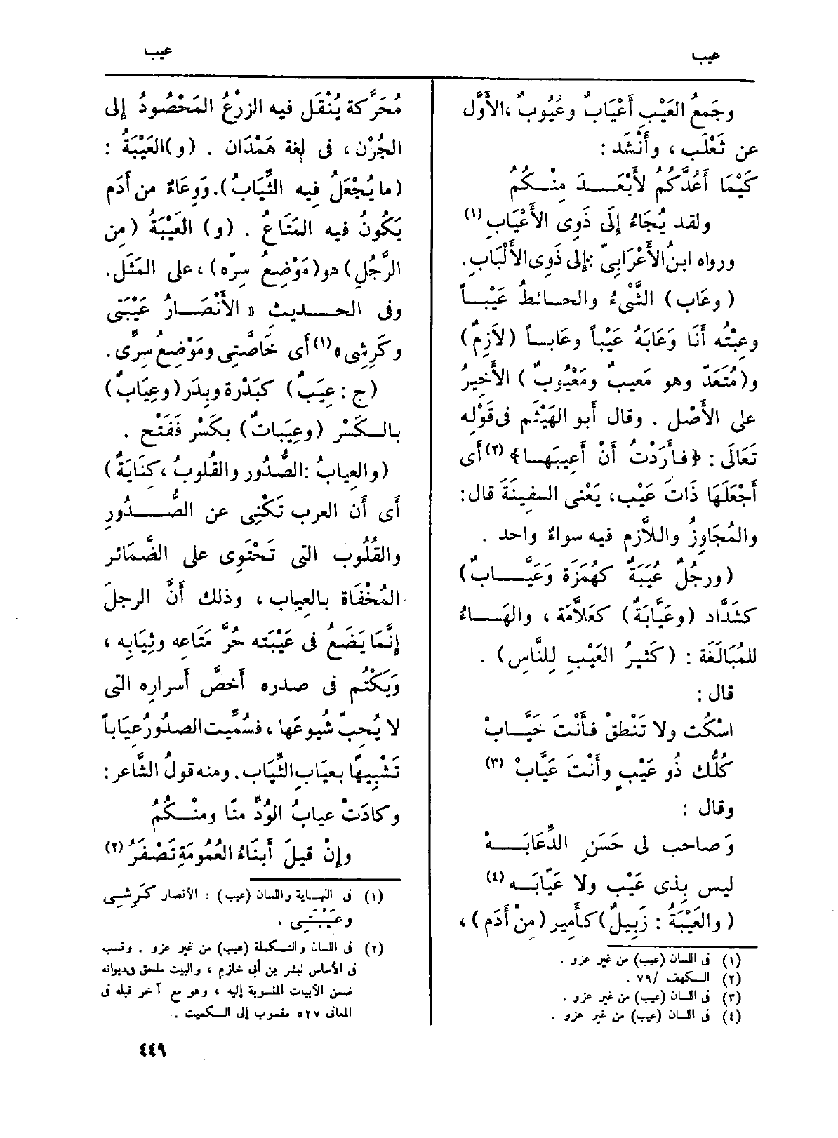 (} وعَاب) الشَّيْءُ والحائطُ {عَيْباً} وعِبْتُه أَنَا وَ {عَابَهُ} عَيْباً {وعَاباً (لَازِمٌ) و (مُتَعَدّوهو} مَعيبٌ {ومَعْيُوبٌ) الأَخِيرُ على الأَصْل. وَقَالَ أَبو الهَيْثَم فِي قَوْلِه تَعَالَى: {فَأَرَدتُّ أَنْ} أعيبها} (الْكَهْف: 79) أَي أَجْعَلَهَا ذَاتَ {عَيْب، يَعْني السفِينَةَ قَالَ: والمُجَاوِزُ واللَّازم فِيهِ سواءٌ وَاحِد.