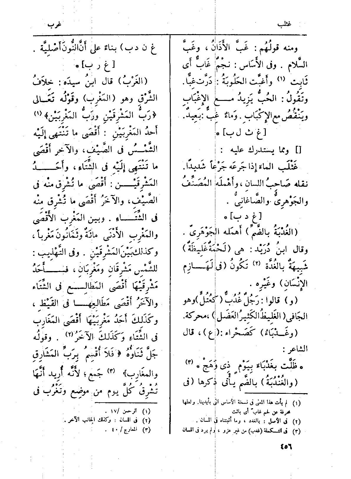 : (الغَرْبُ) قَالَ ابنُ سيدَه: خِلَافُ الشَّرْقِ وَهُوَ (المَغْرِب) وقَوْلُه تَعَالى: {رَبُّ الْمَشْرِقَيْنِ وَرَبُّ الْمَغْرِبَيْنِ} (الرَّحْمَن: 17) أَحدُ المَغْرِبَيْنِ: أَقْصَى مَا تَنْتَهي إِلَيْه الشَّمْسُ فِي الصَّيْف، وَالْآخر أَقْصَى مَا تَنْتَهِي إِلَيْهِ فِي الشِّتَاءِ، وأَحَدُ المَشْرِقَيْن: أَقْصَى مَا تُشْرِق منْه فِي الصَّيْفِ، والآخَرُ أَقْصَى مَا تُشْرِق مِنْه فِي الشِّتَاءِ. وَبَين المَغْرِب الأَقْصَى والمَغْرِبِ الأَدْنَى مائَةٌ وثَمَانُون مَغْرباً، وَكَذَلِكَ بَيْنَ المشْرِقَيْنِ. وَفِي التَّهْذِيب: للشَّمْسِ مَشْرِقَانِ ومَغْرِبَانِ، فأَحَدُ مَشْرِقَيْهَا أَقْصَى المَطالِع فِي الشِّتَاء والآخَرُ أَقْصَى مَطَالِعِها فِي القَيْظِ، وكَذَلِكَ أَحَدُ مَغْرِبَيْهَا أَقْصَى المَغَارِب فِي الشِّتَاءِ وَكذَلكَ الآخَرُ. وقولُه جَلَّ ثَنَاؤُهُ {فَلاَ أُقْسِمُ بِرَبّ الْمَشَارِقِ وَالْمَغَارِبِ} (المعارح: 40) جَمع؛ لأَنَّه أُرِيد أَنَّهَا تُشْرِقُ كُلَّ يَوْم من موضِع وتَغْرُب فِي