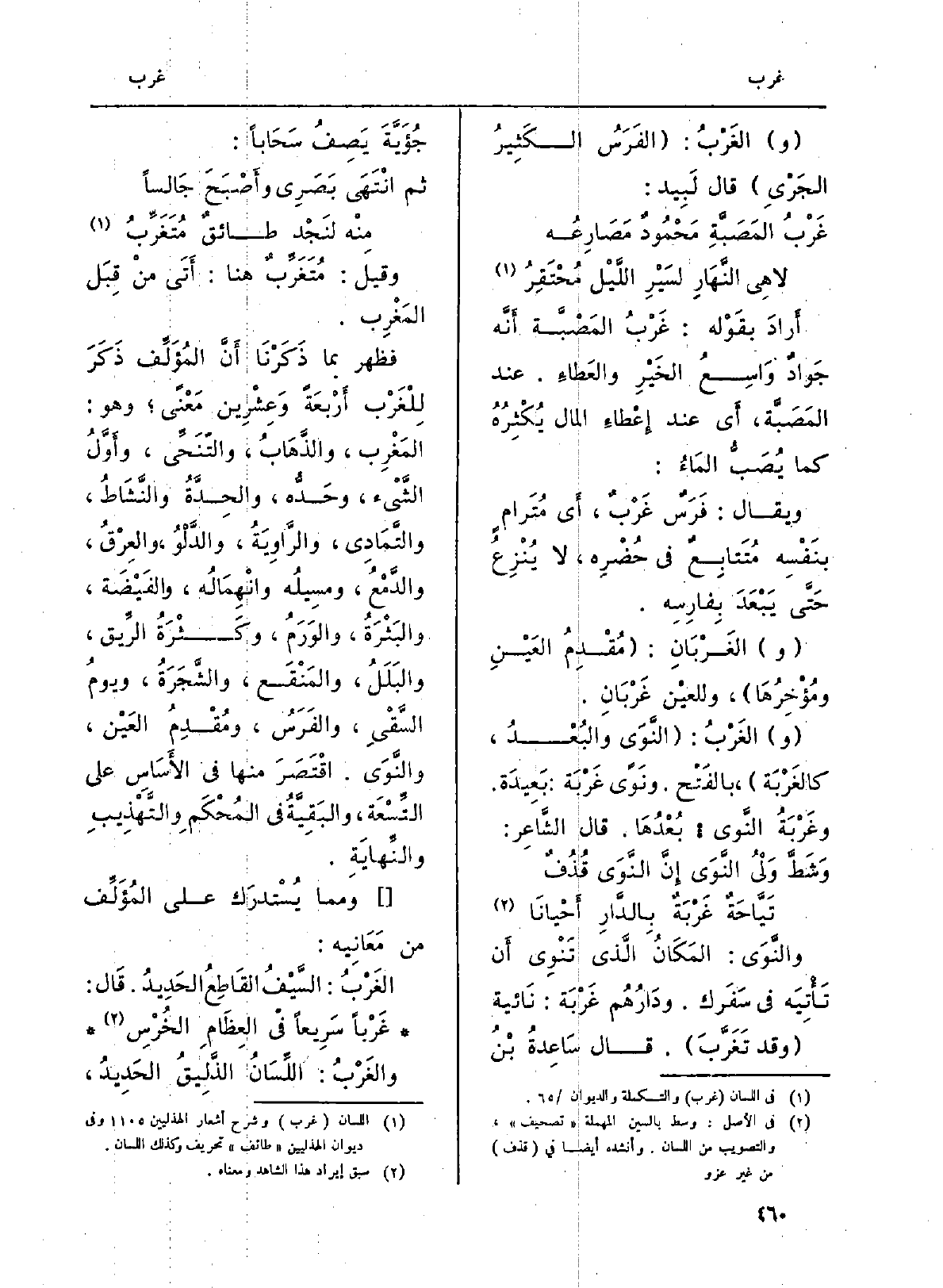فَظهر بِمَا ذَكَرْنَا أَنَّ المُؤَلِّف ذَكَرَ لِلْغَرْب أَرْبعَةً وَعِشْرِين مَعْنًى؛ وَهُوَ: المَغْرِب، والذَّهَابُ، والتّنَحِّي، وأَوَّلُ لشَّيْء، وحَدُّه، الحِدَّةُ والنَّشَاطُ، والتَّمَادِي، والرَّاوِيَةُ، والدَّلْوُ، والعِرْقُ، والدَّمْعُ، ومسِيلُه وانْهِمَالُه، والفَيْضَة، والبَثْرَةُ، والوَرَمُ، وكَثْرَةُ الرِّيق، والبَلَلُ، والمَنْقَع، والشَّجَرَةُ، ويومُ السَّقْيِ، والفَرَسُ، ومُقْدِمُ العَيْن والنَّوَى. اقْتَصَرَ مِنْهَا فِي الأَسَاسِ على التِّسْعَة، والبَقِيَّةُ فِي المُحْكَمِ والتَّهْذِيبِ والنِّهايَةِ.