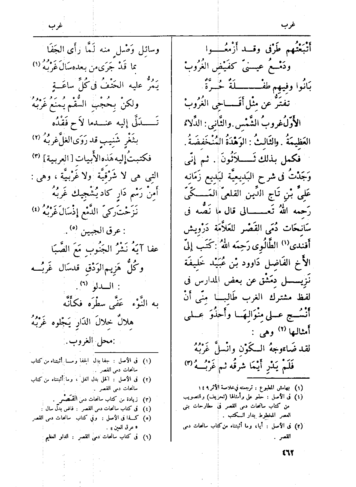 فكمل بذلك ثَلَاثُونَ. ثمَّ إِنّي وَجَدْتُ فِي شرح البَدِيعِيَّة لبَدِيع زَمَانِه عَلِيِّ بْنِ تَاج الدِّين القلعيّ المَكّيّ رَحِمه اللهُ تَعالى قَالَ مَا نَصُّه فِي سَانِحَات دُمَى القَصْر للعَلَّامَة دَرْوِيش أَفندي الطَّالُوِي رَحِمَه اللهُ: كَتَب إِليّ الأَخ الفَاضِل دَاوود بْن عُبَيْد خَلِيفَة نَزِيل دِمَشْق عَن بعض الْمدَارِس فِي لفظ مُشْتَرك الغرب طَالِباً مِنْي أَنْ أَنْسُج على مِنْوَالِهَا وأَحذُوَ على أَمثالها وَهِي: