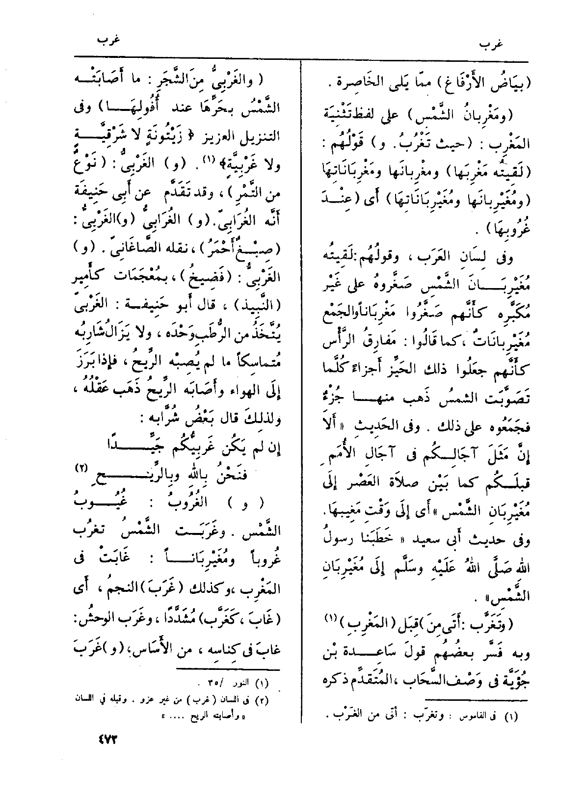 وَفِي لِسَانِ العَرَب، وقولُهُم: لَقِيتُه مُغَيْرِبَانَ الشَّمْسِ صَغَّروهُ على غَيْر مُكَبَّرِه كأَنَّهم صَغَّرُوا مَغْرِبَاناً والجَمْع مُغَيْرِبانَاتٌ، كَمَا قَالُوا: مَفارِقُ الرَّأْس كأَنَّهم جعَلُوا ذَلِك الحَيِّز أَجزاءً كُلَّما تَصَوَّبَت الشمسُ ذَهب مِنْهَا جُزْءٌ فجَمَعُوه على ذَلِك. وَفِي الحَديثِ (أَلَا إِنَّ مَثَلَ آجَالِكُم فِي آجَال الأُمَم قبلَكُم كَمَا بَيْن صلَاة العَصْر إِلَى مُغَيْرِبَانِ الشَّمْس) أَي إِلَى وَقْت مَغِيبهَا. وَفِي حَدِيث أَبي سعيد (خَطَبَنَا رسولُ اللهِ صَلَّى اللهُ عَلَيْهِ وسَلَّم إِلَى مُغَيْرِبَانِ الشَّمْسِ) .