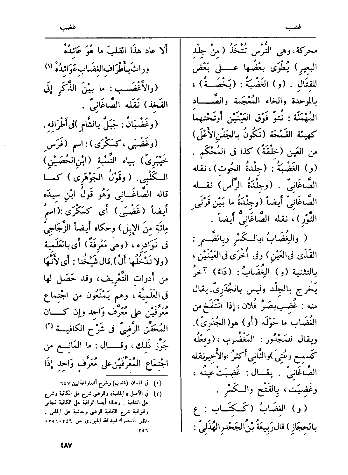 محركة، وَهِي التُّرْس تُتَّخَذُ (مِنْ جِلْدِ البعِيرِ) يُطْوَى بعْضُها على بَعْض للقِتَالِ. (و) الغَضْبَةُ: (بَخْصَةٌ) ، بِالْمُوَحَّدَةِ وَالْخَاء المُعْجَمة والصَّادِ المُهْمَلَة: نُتوّ فَوْق العَيْنَيْن أَو تَحْتهما كَهَيئَةِ القَمْحَة (تَكُونُ بالجَفْنِ الأَعْلَى) من العَين (خِلْقَةً) كَذَا فِي المُحْكَم. (و) الغَضْبَةُ: (جِلْدةُ الحُوتِ) ، نَقله الصَّاغَانِيّ. (وجِلْدَةُ الرَّأْس) نَقله الصَّاغَانِيّ أَيضاً (وجِلْدَةُ مَا بَيْن قَرْنَيِ الثَّوْرِ) ، نَقله الصَّاغَانِيُّ أَيضاً.