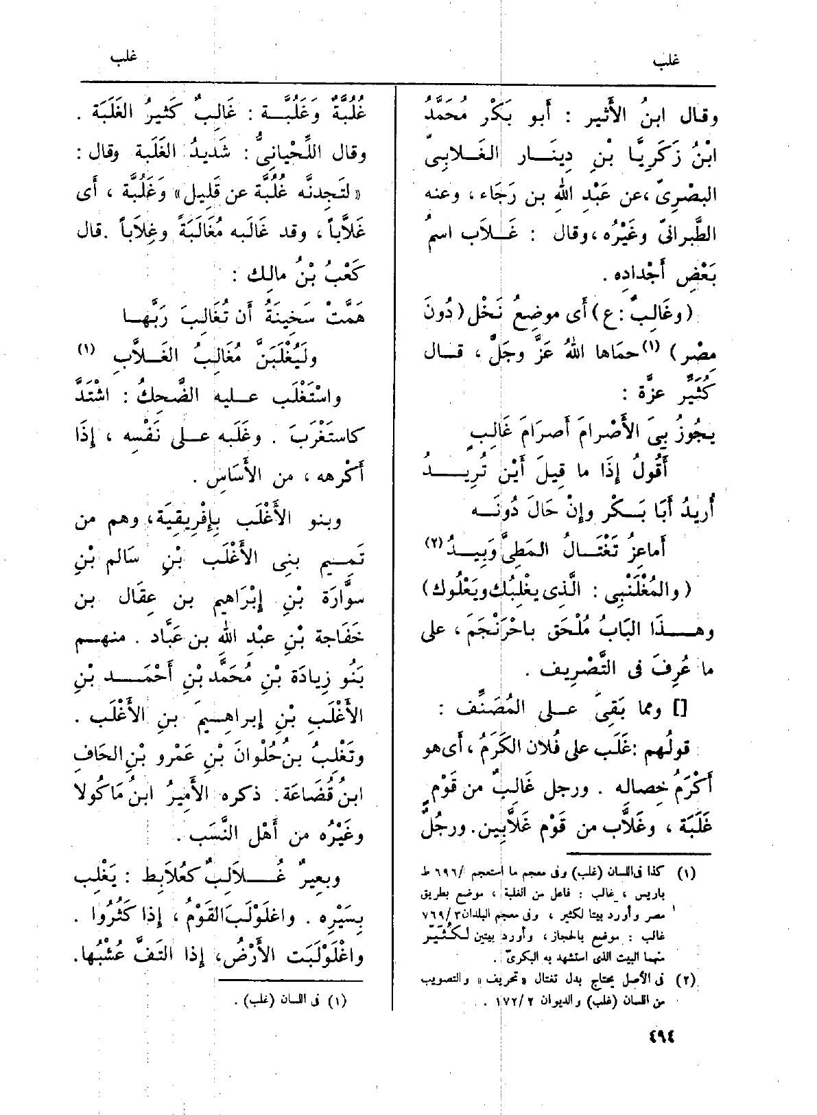 قولُهم: غَلَب على فُلان الكَرَمُ، أَي هُوَ أَكْرَمُ خِصالِه. وَرجل غَالِبٌ من قَوْمٍ غَلَبَة، وغَلَّاب من قَوْم غَلَّابِين. ورجُلٌ غُلُبَّةٌ وَغَلُبَّة: غَالِبٌ كَثيرُ الغَلَبَة. وَقَالَ اللِّحْيانِيُّ: شَديدُ الغَلَبة وَقَالَ: (لتَجِدنَّه غُلُبَّة عَن قَلِيل) وَغَلُبَّة، أَي غَلَّاباً، وَقد غَالَبه مُغَالَبَةً وغِلَاباً. قَالَ كَعْبُ بْنُ مالِك: