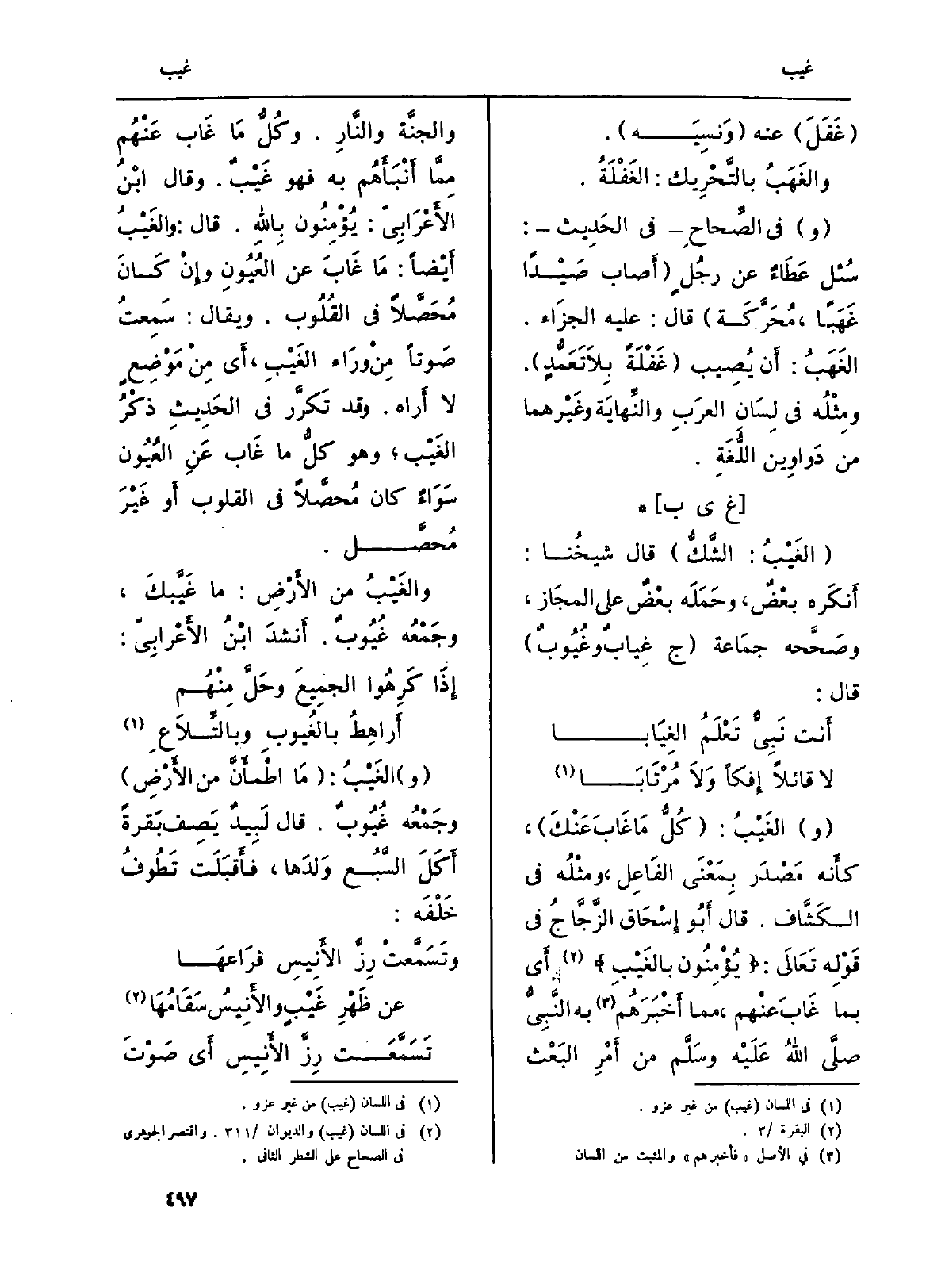 (و) الغَيْبُ: (كُلُّ مَا {غَابَ عَنْكَ) ، كأَنه مَصْدَر بِمَعْنَى الفَاعِل، ومثْلُه فِي الكَشَّاف. قَالَ أَبُو إِسْحَاق الزَّجَّاجُ فِي قَوْلِه تَعَالَى: {يُؤْمِنُونَ} بِالْغَيْبِ} (الْبَقَرَة: 3) أَي بِمَا غَابَ عنْهم، مِمَّا أَخْبَرَهُم بِهِ النَّبِيُّ صلَّى اللهُ عَلَيْه وسَلَّم من أَمْرِ البَعْث والجنَّة والنَّارِ. وكُلُّ مَا غَاب عَنْهُم مِمَّا أَنْبَأَهُم بِهِ فَهُوَ {غَيْبٌ. وَقَالَ ابْنُ الأَعْرَابِيّ: يُؤْمِنُون بِاللهِ. قَالَ:} والغَيْبُ أَيْضاً: مَا غَابَ عَن العُيُونِ وإِنْ كَانَ مُحَصَّلاً فِي القُلُوب. وَيُقَال: سَمِعتُ صَوتاً مِنْ ورَاء الغَيْبِ، أَي مِنْ مَوْضِعٍ لَا أَراه. وَقد تَكرَّر فِي الحَدِيثِ ذكْرُ الغَيْب؛ وَهُوَ كلُّ مَا غَاب عَنِ العُيُون سَوَاءٌ كَانَ مُحصَّلاً فِي الْقُلُوب أَو غَيْرَ مُحصَّل.