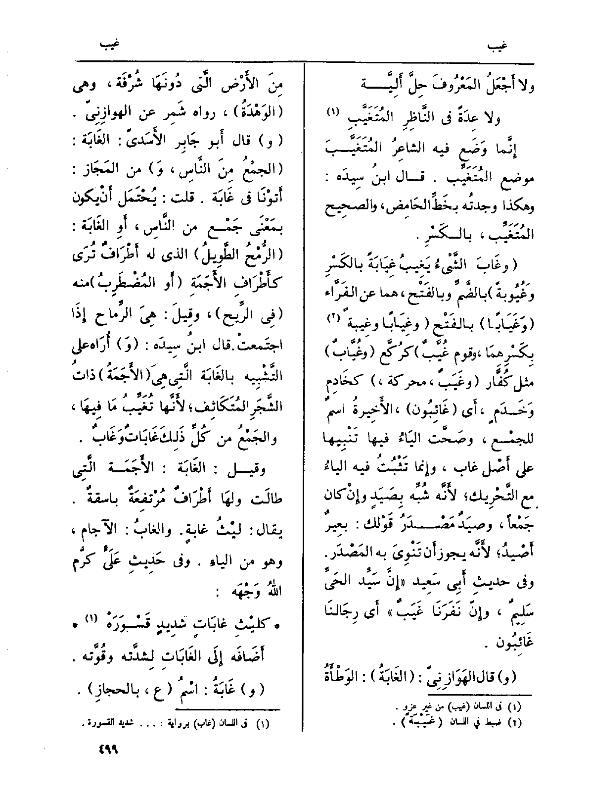 وَقيل: الغَابَة: الأَجَمَة الَّتِي طالَت ولهَا أَطْرَافٌ مُرْتفِعَةٌ باسقةٌ. يُقَال: ليْثُ} غابةٍ. {والغابُ: الآجام، وَهُوَ من الياءِ. وَفِي حَدِيثِ عَلَيَ كرَّم اللهُ وَجْهَه: