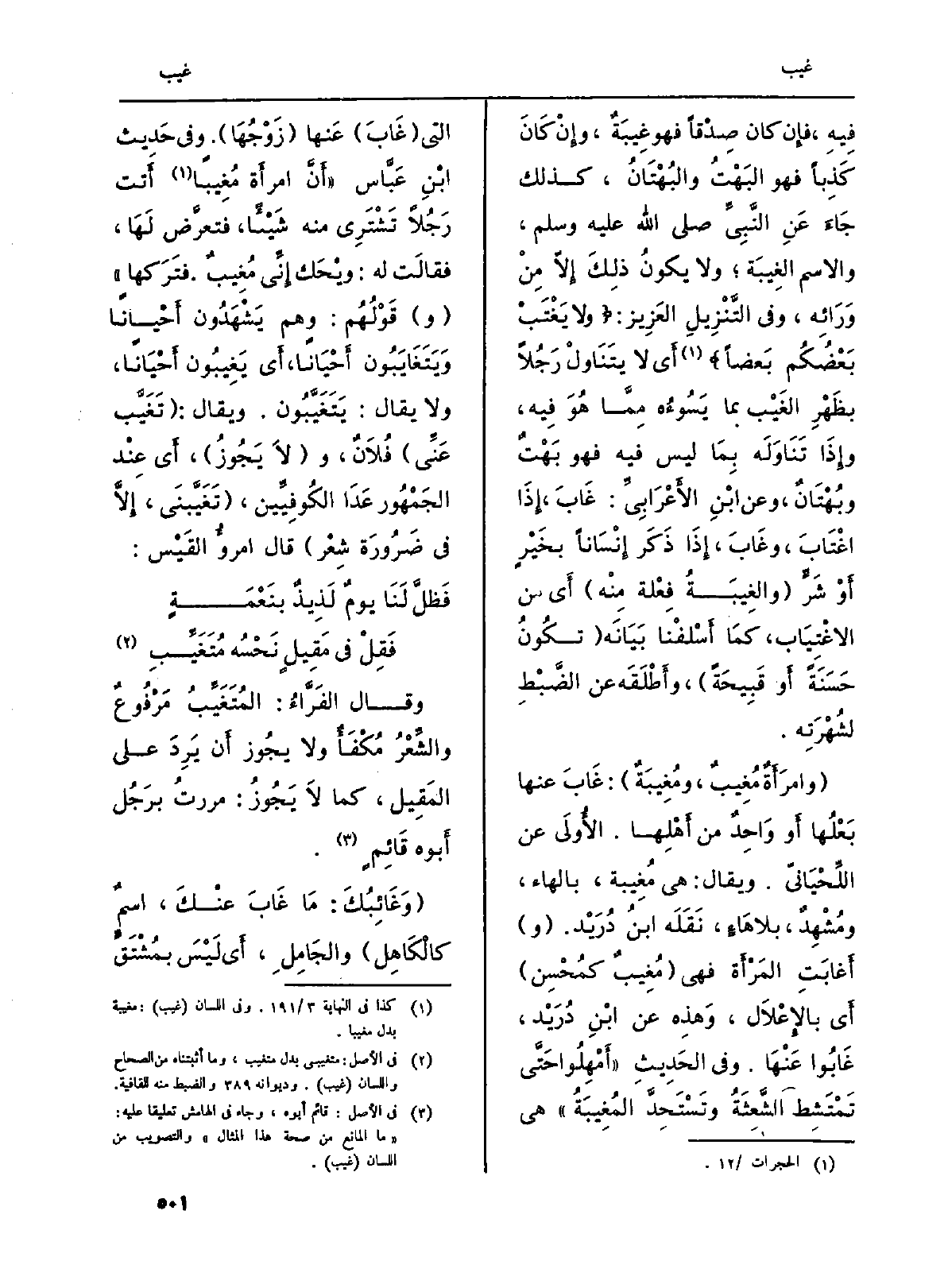 فِيهِ، فإِن كَانَ صِدْقاً فَهُوَ غِيبَةٌ، وإِنْ كَانَ كَذِباً فَهُوَ البَهْتُ البُهْتَانُ، كَذَلِك جَاءَ عَنِ النَّبِيِّ صلَّى اللهُ عليْه وسلَّم، وَالِاسْم {الغِيبَة؛ وَلَا يكونُ ذلِكَ إِلّا مِنْ وَرَائِه، وَفِي التَّنْزِيلِ العَزِيز: {وَلاَ} يَغْتَب بَّعْضُكُم بَعْضاً} (الحجرات: 12) أَي لَا يتَنَالْ رَجُلاً بظَهْرِ الغَيْب بِمَا يَسُوءُه مِمَّا هُوَ فِيه، وإِذَا تَنَاوَلَه بِمَا لَيْسَ فِيهِ فَهُوَ بَهْتٌ وبُهْتَانٌ، وَعَن ابْنِ الأَعْرَابِيِّ: غَابَ، إِذَا {اغْتَابَ، وغَابَ، إِذَا ذَكَر إِنْسَاناً بخَيْرٍ أَوْ شَرَ (} والغِيبَةُ فِعْلة مِنْه) أَي من الاغْتِيَاب، كمَا أَسْلفْنَا بَيَانَه (تكُونُ حَسَنَةً أَو قَبِيحَةً) ، وأَطْلَقَه عَن الضَّبْطِ لشُهْرَتِه.