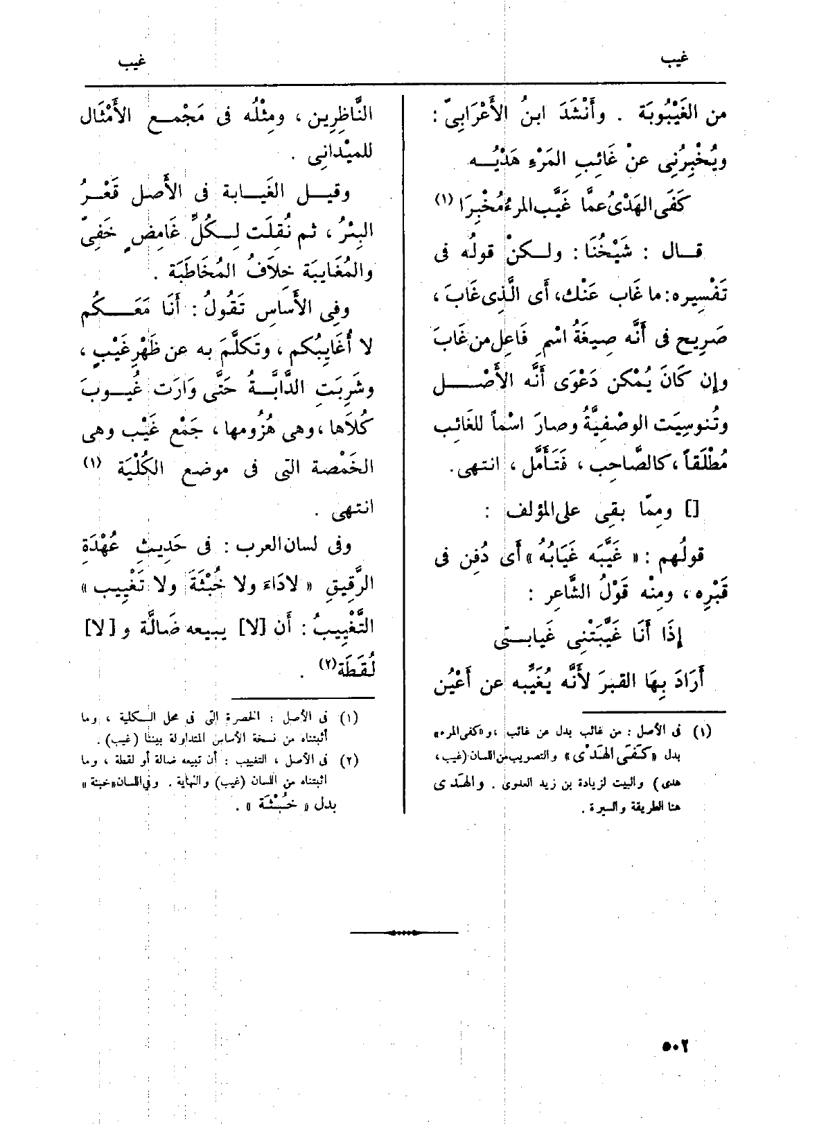قَالَ: شَيْخُنَا: ولكنْ قولُه فِي تَفْسِيره: مَا غَاب عَنْك، أَي الَّذِي غَابَ، صَرِيح فِي أَنَّه صِيغَةُ اسْمِ فَاعِل من غَابَ وإِن كَانَ يُمْكن دَعْوَى أَنَّه الأَصْل وتُنوسِيَ الوصْفِيَّةُ وصارَ اسْماً للغَائِب مُطْلَقاً، كالصَّاحِب، فَتَأَمَّل، انْتهى.