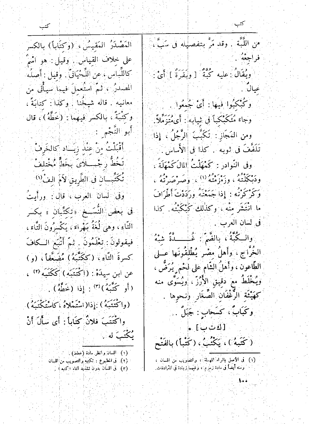 وَفِي لِسَان الْعَرَب، قَالَ: ورأَيتُ فِي بعض النُّسَخ: (تِكِتِّبانِ) بِكَسْر التّاءِ، وَهِي لُغَةُ بَهْراءَ، يَكْسِرُونَ التَّاءَ، فيقولونَ: تِعْلَمُونَ. ثمّ أَتْبَع الكافَ كسرةَ التّاءِ، (كَكَتَّبَهُ) مُضَعَّفاً، (و) عَن ابْن سِيدَهْ: (اكْتَتَبَه) كَكَتَبَه، (أَوْ كَتَّبَهُ) : إِذا (خَطَّهُ) .