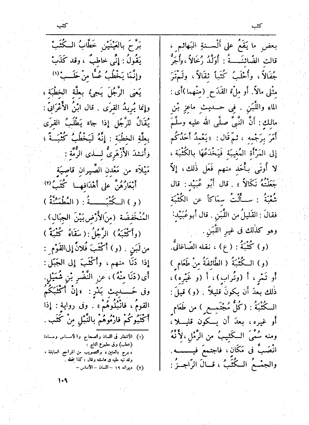 بعضِ مَا يَقَعُ على أَلْسنةِ البَهائمِ، قالتِ الضّائِنَةُ: أُوَلَّدُ رُخَالاً، وأُجَرُّ جُفَالاً، وأُحْلَبُ كُثَباً ثِقَالاً، ولَمْ تَرَ مِثْلى مَالا. أَوْ مِلْءُ القَدَحِ (مِنْهما) أَي: الماءِ واللَّبَنِ. فِي حديثِ ماعِزِ بْنِ مالِكٍ: أَنَّ النَّبيَّ صلى الله عَلَيْهِ وسلمأَمَرَ بِرَجْمِهِ، ثمّ قَال: (يَعْمِدُ أَحَدُكُم إِلى المَرْأَةِ المُغِيبَةِ فَيَخْدَعُهَا بالكُثْبَة، لَا أُوتَى بأَحَدِ مِنْهُم فَعَل ذالك، إِلاّ جَعَلْتُهُ نَكَالاً) . قَالَ أَبُو عُبَيْدٍ: قَالَ شُعْبَةُ: سأَلْتُ سِمَاكاً عَن الكُثْبَةِ فقالَ: القَليلُ من اللَّبَنِ. قَالَ أَبو عُبَيْدٍ: وَهُوَ كذالك فِي غيرِ اللَّبَنِ.