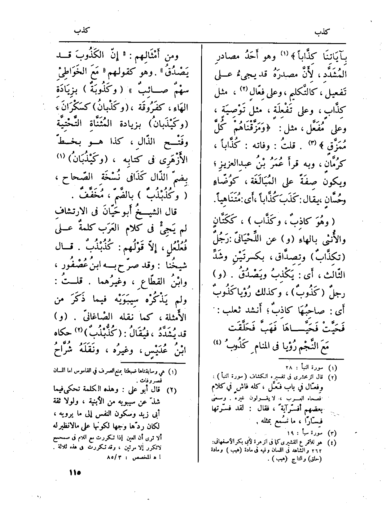 بِآيَاتِنَا كذابا} (النبأ: 38) ، وَهُوَ أَحَدُ مصادرِ المُشَدَّدِ، لاِءَنَّ مصدرَهُ قد يجيءُ على تَفعيل، كالتَّكليم، وعَلى فِعّالٍ، مثل كِذَّابٍ، وعَلى تَفْعِلَةٍ، مثل تَوْصِيَةٍ، وعَلى مُفَعَّل، مثل: {وَمَزَّقْنَاهُمْ كُلَّ مُمَزَّقٍ} (سبأ: 19) . قلتُ: وَفَاته: كُذَّاباً، كرُمَّانٍ، وَبِه قرأَ عُمَرُ بْنُ عبدِ العزيزِ؛ وَيكون صِفَةً على المُبَالَغَة، كوُضّاءٍ وحُسَّانٍ، يُقَال: كَذَبَ كُذَّاباً، أَي: مُتَنَاهِياً.
