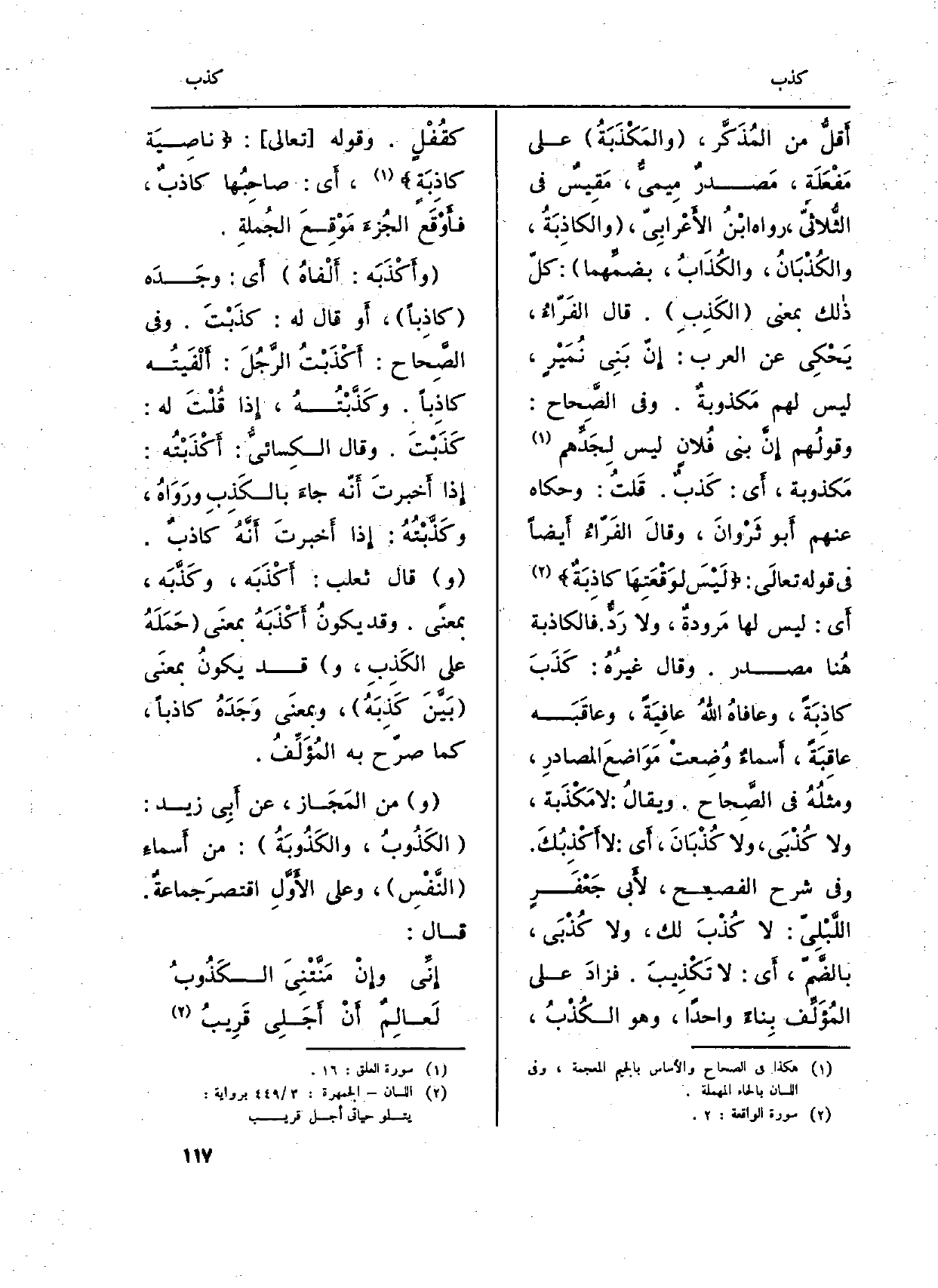 أَقلُّ من المُذَكَّر، (والمَكْذَبَةُ) على مَفْعَلَةٍ، مَصدرٌ مِيميٌّ، مَقِيسٌ فِي الثُّلاثيّ، رَوَاهُ ابْنُ الأَعْرابِيّ، (والكاذِبَةُ، والكُذْبَانُ، والكُذَابُ، بضمِّهما) : كلّ ذالك بِمَعْنى (الكَذِبِ) . قَالَ الفَرّاءُ، يَحْكِي عَن الْعَرَب: إِنّ بَنِي نُمَيْرٍ، لَيْسَ لَهُم مَكذوبةٌ. وَفِي الصَّحاح: وقولُهم: إِنَّ بني فُلانٍ لَيْسَ لِجَدِّهم مَكذوبة، أَي: كَذبٌ. قلتُ: وَحَكَاهُ عَنْهُم أَبو ثَرْوانَ، وقالَ الفَرّاءُ أَيضاً فِي قَوْله تعالَى: {لَيْسَ لِوَقْعَتِهَا كَاذِبَةٌ} (الْوَاقِعَة: 2) ، أَي: لَيْسَ لَهَا مَرودةٌ، وَلَا رَدٌّ. فالكاذبة هُنا مصدر. وَقَالَ غيرُهُ: كَذَبَ كاذِبَةً، وعافاهُ اللَّهُ عافِيَةً، وعاقَبَه عاقِبَةً، أَسماءٌ وُضِعتْ مَوَاضعَ المصادرِ، ومثلُهُ فِي الصَّحاح. ويقالُ: لَا مَكْذَبة، وَلَا كُذْبَى، وَلَا كُذْبَانَ، أَي: لَا أَكْذِبُكَ. وَفِي شرح الفصيح، لأَبي جَعْفَرٍ اللَّبْلِيّ: لَا كُذْبَ لَك، وَلَا كُذْبَى، بالضَّمِّ، أَي: لَا تَكْذِيبَ. فزادَ على المُؤلِّف بِناءً وَاحِدًا، وَهُوَ الكُذْبُ، كقُفْلٍ. وَقَوله تَعَالَى: {نَاصِيَةٍ كَاذِبَةٍ} (العلق: 16) ، أَي: صاحِبُها كاذبٌ، فأَوْقَع الجُزءَ مَوْقِعَ الجُملةِ.