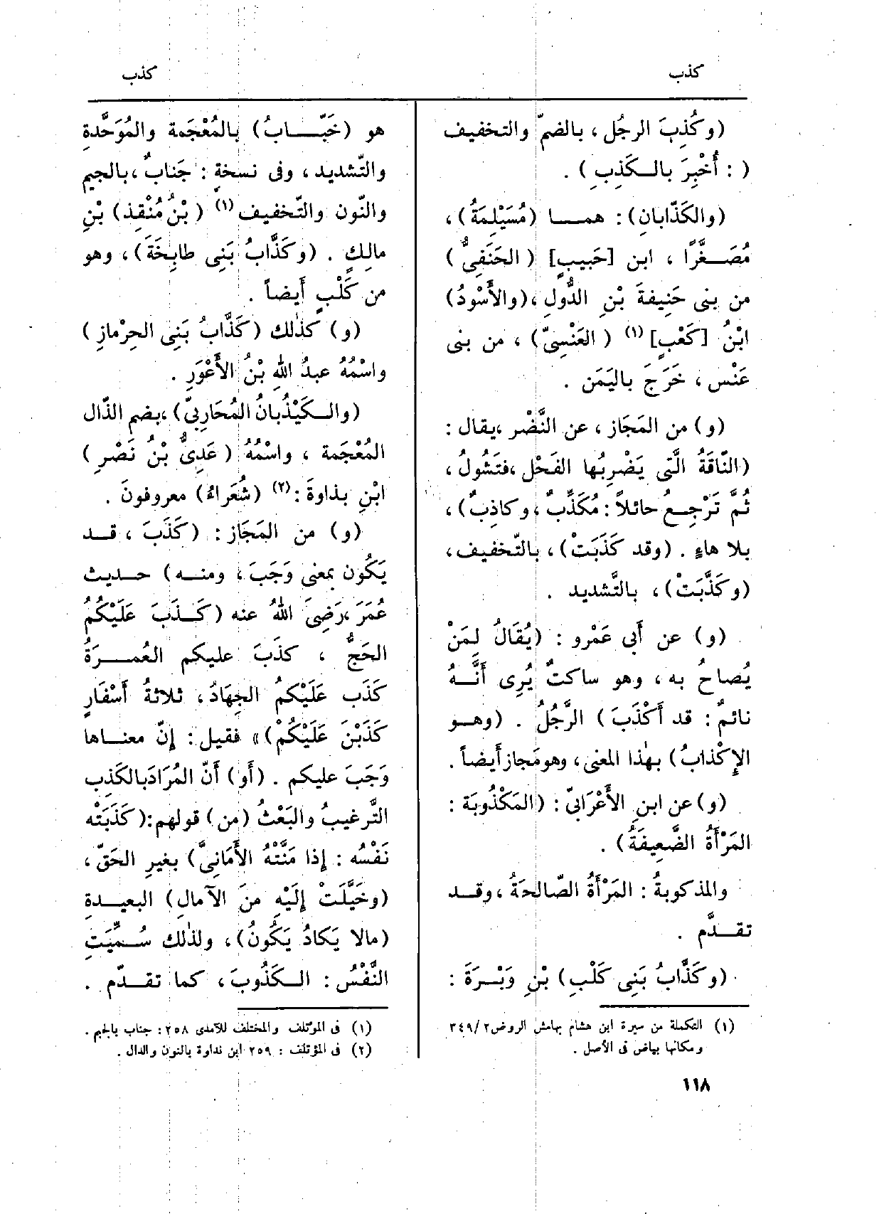 (و) من المَجَاز: (كَذَبَ، قد يَكُون بمنى وَجَبَ، وَمِنْه) حَدِيث عُمَرَ، رَضِيَ اللَّهُ عَنهُ (كَذَبَ عَلَيْكُمُ الحَجُّ، كذَبَ عَلَيْكُم العُمرَةُ كَذَب عَلَيْكُم الجِهَادُ، ثلاثةُ أَسْفَارٍ كَذَبْنَ عَلَيْكُمْ)) فَقيل: إنّ مَعْنَاهَا وَجَبَ عَلَيْكُم. (أَو) أَنّ المُرَادَ بالكَذِب التَّرغيبُ والبَعْثُ (من) قَوْلهم: (كَذَبَتْه نَفْسُه: إِذا مَنَّتْهُ الأَمَانِيَّ) بغيرِ الحَقّ، (وخَيَّلَتْ إِلَيْهِ منَ الآمالِ) البعيدةِ (مَا لَا يَكادُ يَكُونُ) ، ولذالك سُمِّيَتِ النَّفْسُ: الكَذُوبَ، كَمَا تقدّم.