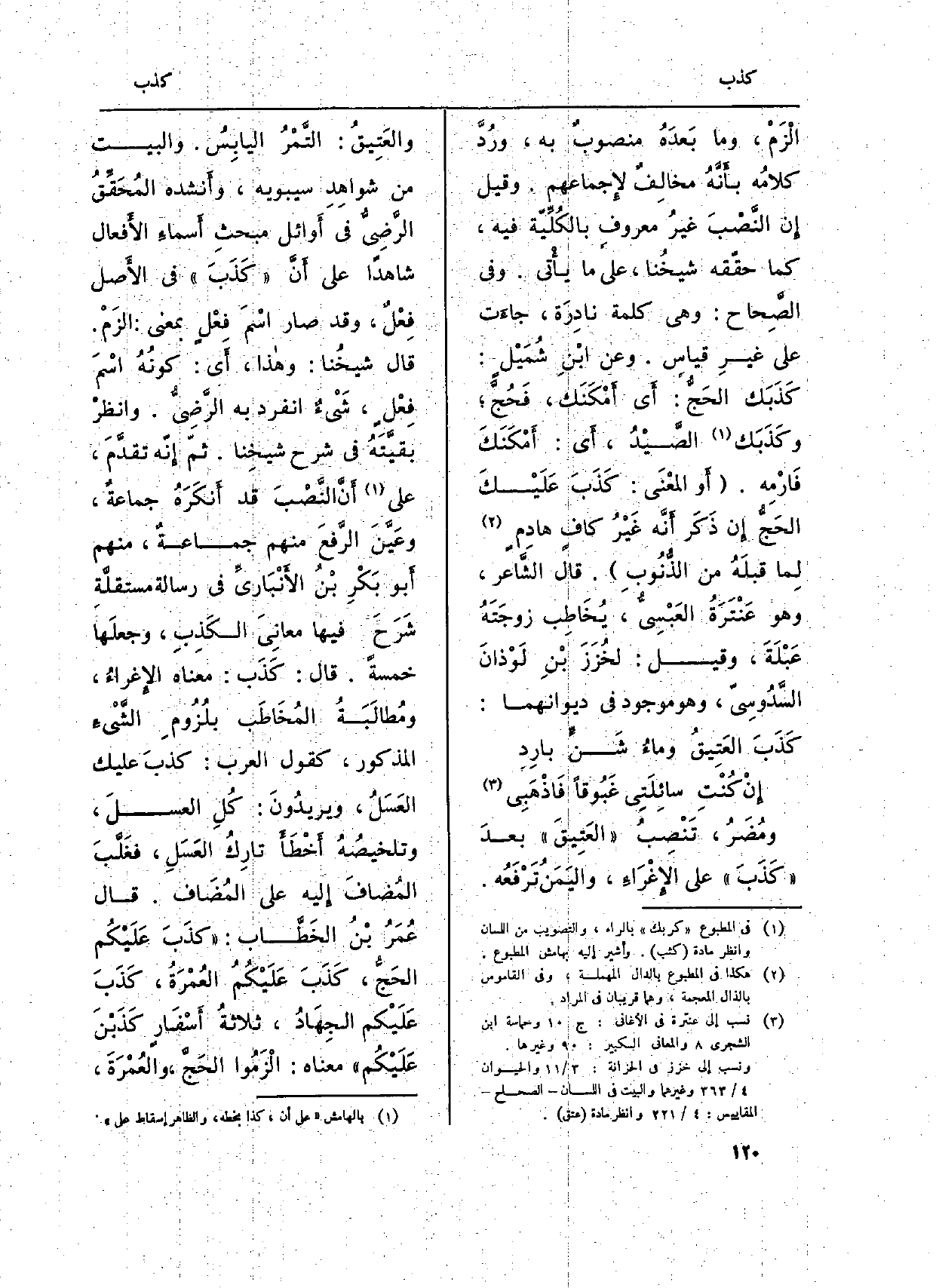 ومُضَرُ، تَنْصِبُ (العَتِيقَ) بعدَ (كَذَبَ) على الإِغْرَاءِ، واليَمَنُ تَرْفَعُه. والعَتِيقُ: التَّمْرُ اليابِسُ. وَالْبَيْت من شواهِدِ سِيبَوَيْهٍ، وأَنشده المُحَقِّقُ الرَّضِيُّ فِي أَوائل مبحثِ أَسماءِ الأَفعال شَاهدا على أَنَّ (كَذَبَ) فِي الأَصل فِعْلٌ، وَقد صَار اسْمَ فِعْلٍ بِمَعْنى: الزَمْ. قَالَ شيخُنا: وهاذا، أَي: كونُهُ اسْمَ فِعْلٍ، شَيْءٌ انْفَرد بِهِ الرَّضِيُّ. وانظرْ بقيَّتَهُ فِي شرح شيخِنا. ثمّ إِنَّه تقدَّمَ، على أَنَّ النَّصْبَ قد أَنكَرَهُ جماعةٌ، وعَيَّنَ الرَّفعَ مِنْهُم جماعةٌ، مِنْهُم أَبو بَكْرِ بْنُ الأَنْبَاريِّ فِي رِسَالَة مستقلَّةٍ شَرَحَ فِيهَا معانِيَ الكَذِبِ، وجعلَها خَمْسَة. قَالَ: كَذَب: مَعْنَاهُ الإِغراءُ، ومُطالَبَةُ المُخَاطَب بلُزُومِ الشَّيْءِ الْمَذْكُور، كَقَوْل الْعَرَب: كذبَ عَلَيْك العَسَلُ، ويريدُونَ: كُلِ العسلَ، وتلخيصُهُ أَخْطَأَ تارِكُ العَسَلِ، فغَلَّبَ المُضافَ إِليه على المُضَاف. قَالَ عُمَرُ بْنُ الخَطَّاب: (كذَبَ عَلَيْكُم الحَجُّ، كَذَبَ عَلَيْكُمُ العُمْرَةُ، كَذَبَ عَلَيْكم الجِهَادُ، ثلاثةُ أَسْفَارٍ كَذَبْنَ عَلَيْكُم) مَعْنَاهُ: الْزَمُوا الحَجَّ، والعُمْرَةَ،