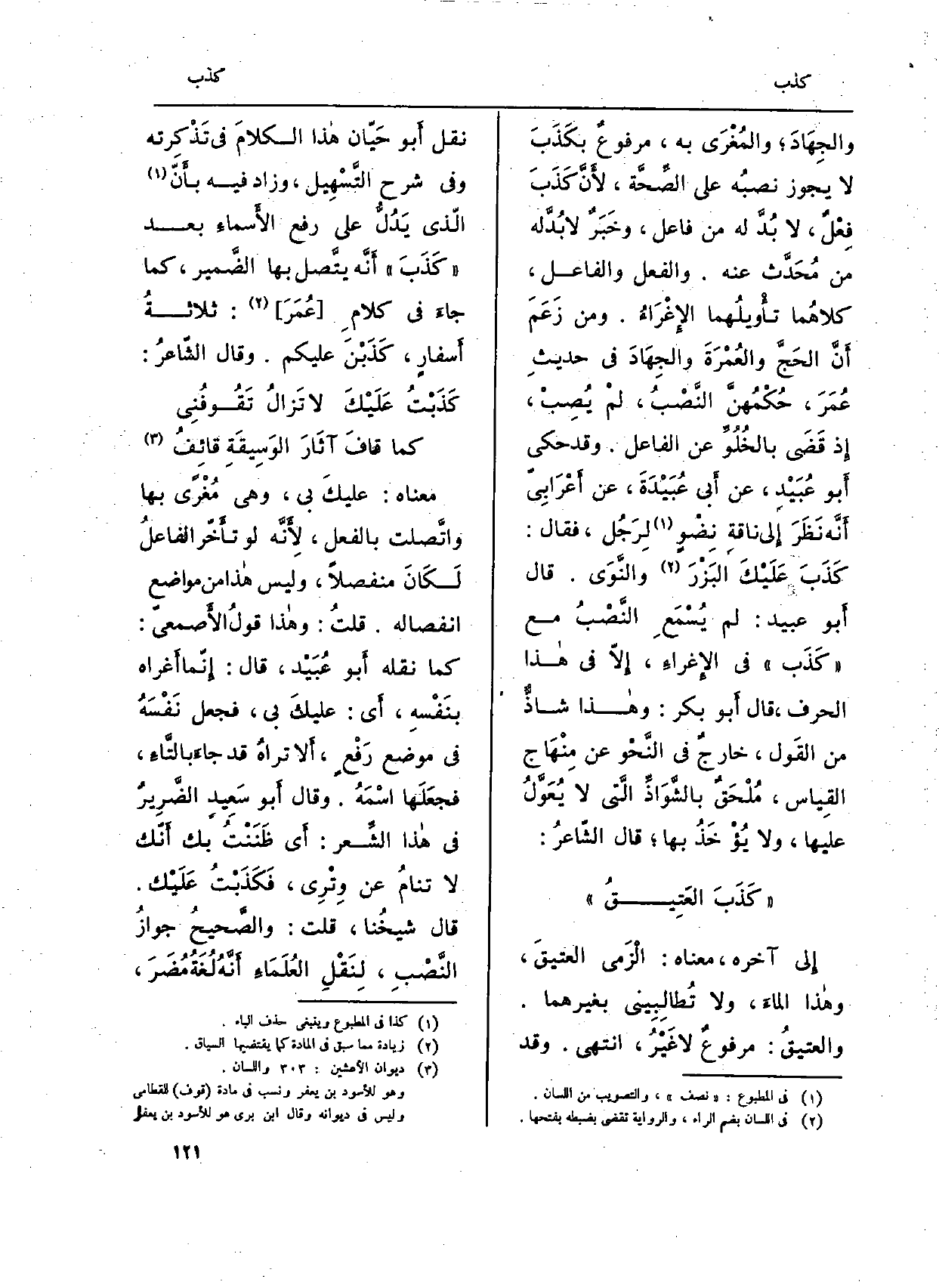 إِلَى آخِره، مَعْنَاهُ: الْزَمي العتيقَ، وهاذا الماءَ، وَلَا تُطالِبِيني بِغَيْرِهِمَا. والعتيقُ: مرفوعٌ لَا غَيْرُ، انْتهى. وَقد نقل أَبو حَيّان هاذا الكلامَ فِي تذْكِرته. وَفِي شرح التَّسْهِيل، وَزَاد فِيهِ بأَنّ الّذي يَدُلُّ على رفع الأَسماءِ بعد (كَذَبَ) أَنَّه يتَّصل بهَا الضَّمير، كَمَا جاءَ فِي كلامِ عُمَرَ: ثلاثةُ أَسفارٍ، كَذَبْنَ عَلَيْكُم. وَقَالَ الشّاعرُ: