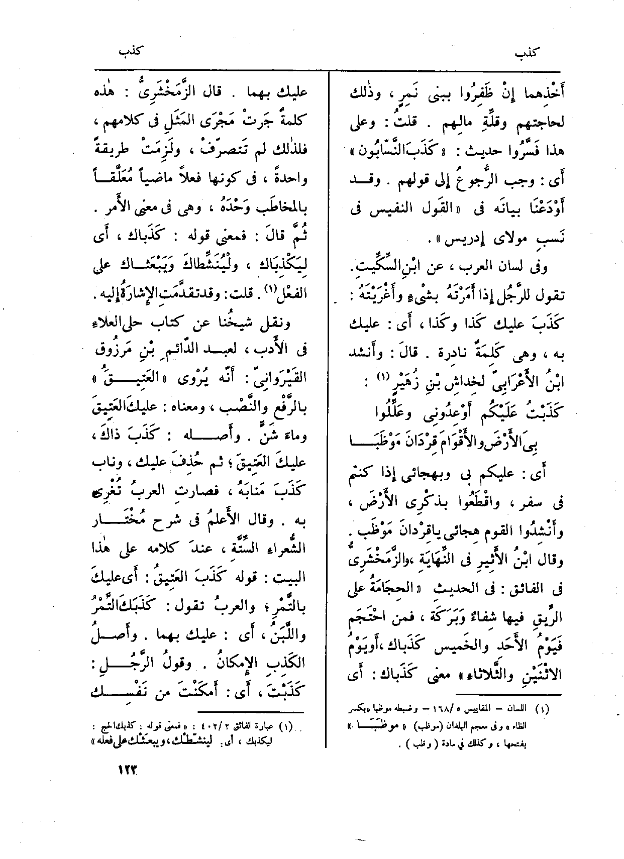 وَفِي لِسَان الْعَرَب، عَن ابْنِ السِّكِّيتِ. تَقول للرَّجُل إِذا أَمَرْتَهُ بشيْءٍ وأَغْرَيْتَهُ: كَذَبَ عَلَيْك كَذا وكَذا، أَي: عَلَيْك بِهِ، وَهِي كَلِمَةٌ نادِرة. قالَ: وأَنشد ابْنُ الأَعْرَابِيّ لخِداشِ بْنِ زُهَيْرٍ: